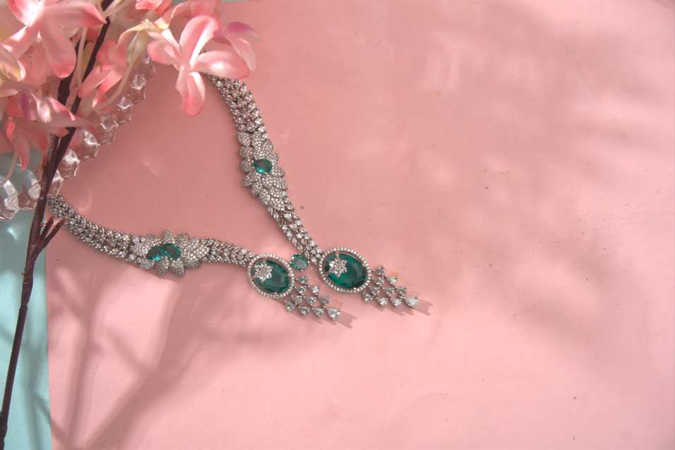 24K Gold Plated American Diamond Floral Necklace and Earrings Set with Green and White StonesVendor: NisckaExude floral elegance with this 24K gold-plated American Diamond necklace and earrings set, featuring a flower-shaped pendant adorned with green and white AD stones. Handcrafted perfection for parties, festivals, and special occasions.