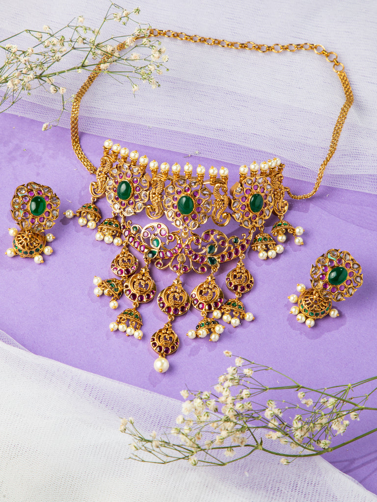 24K Gold Plated Pink and Green Emerald Peacock Choker Necklace Set with EarringsVendor: NisckaProduct Description 24K Gold Plated Peacock Design Choker Necklace Set with Earrings featuring an eccentric and unique design. Adorned with pink, emerald stones, and white pearls. Mesmerizing peacock danglers add charm, perfect for ethnic and festive wear. A true statement piece. Style & Tips...