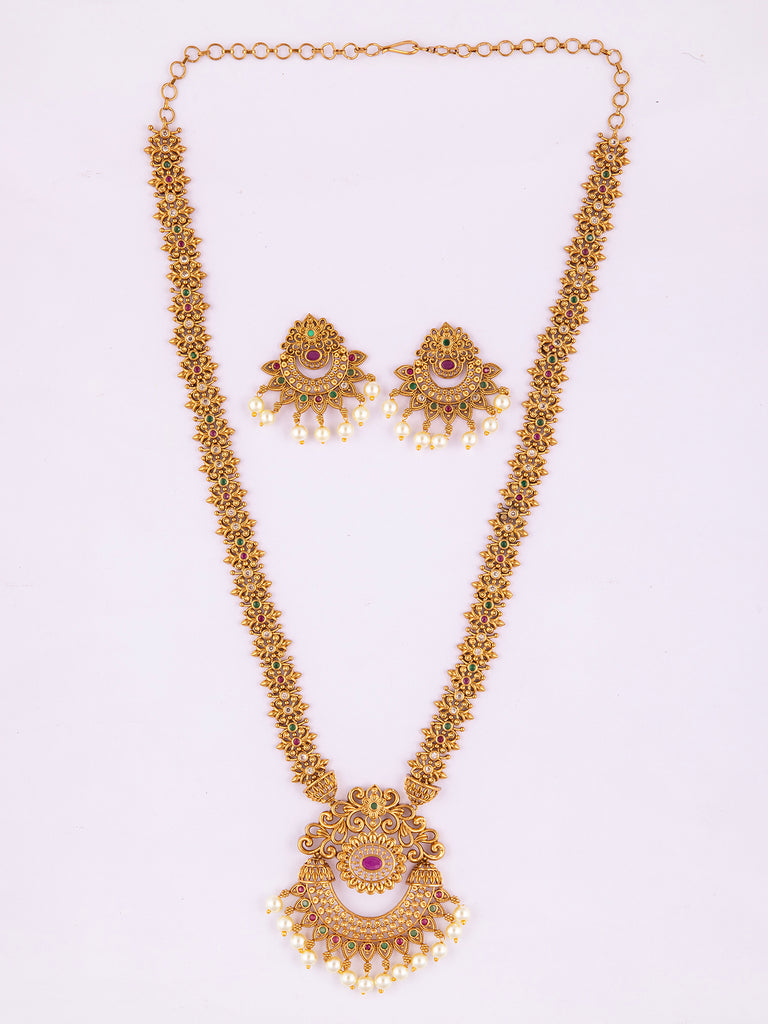 24K Gold Plated Antique Necklace Set with Red & Green StonesVendor: NisckaProduct Description 24K Gold Plated Long Necklace Set with a floral pattern, featuring red and green stones. The antique-style pendant has a beautiful ethnic design with white faux pearls. Paired with traditional semi-circle earrings, this mesmerizing set is perfect for party or function wear....