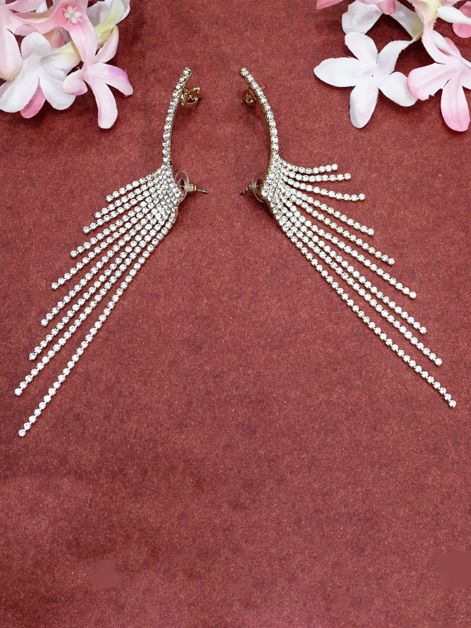 Make a statement with Niscka's stunning chain earrings, featuring dazzling American diamonds and shimmering zircon accents. Expertly crafted with a luxurious rhodium-polished finish, these earrings offer a modern and elegant touch that enhances any outfit. The unique chain design adds movement and sophistication, making them perfect for both casual wear and special occasions. Elevate your jewelry collection with these eye-catching earrings that effortlessly combine contemporary style with timeless elegance.