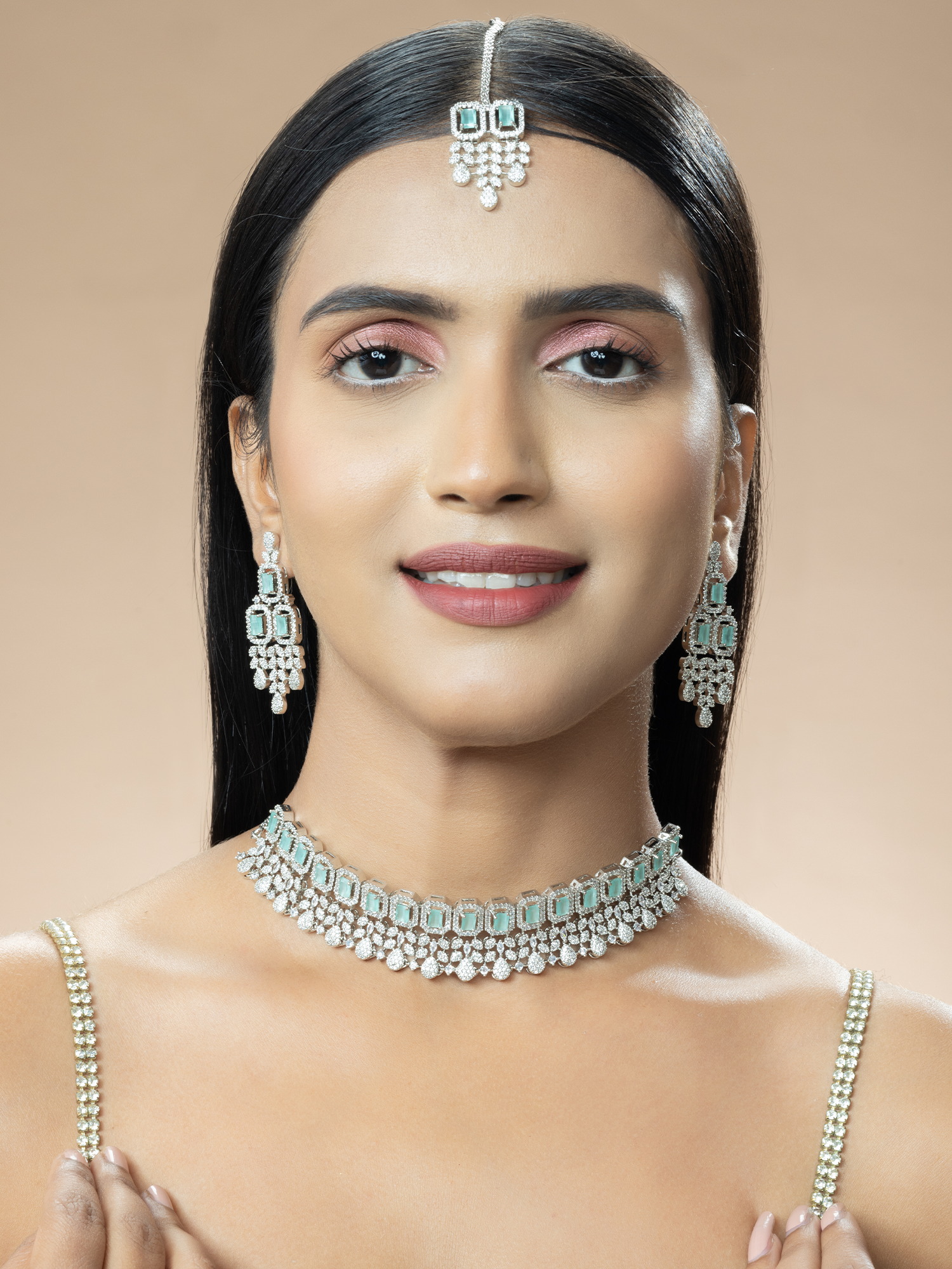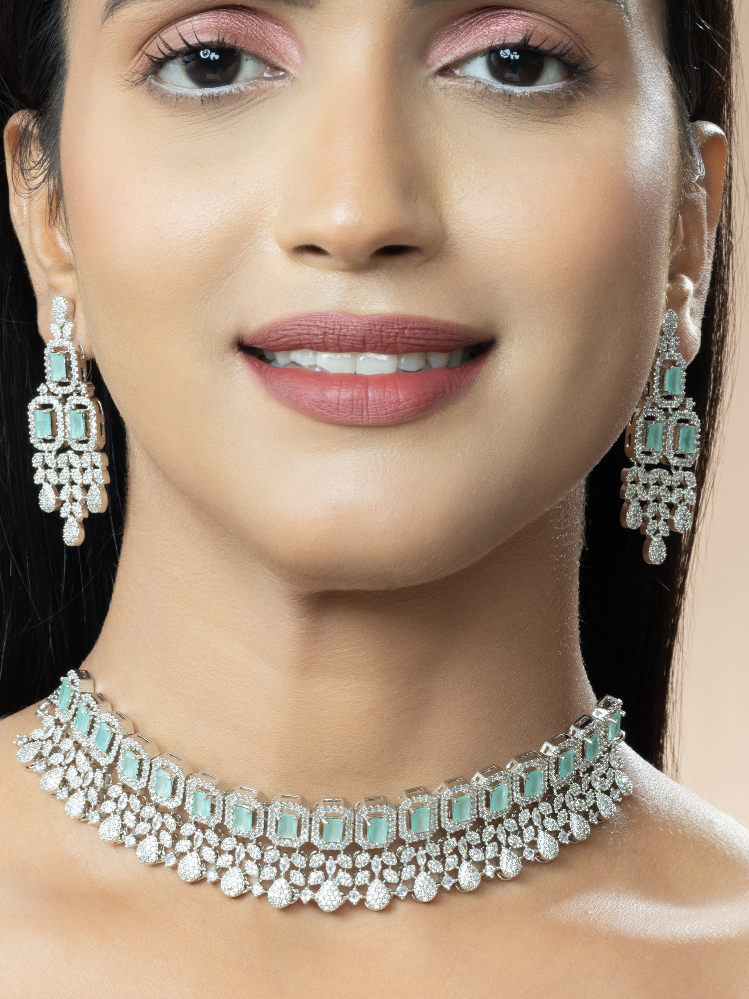 Discover elegance with our Mint Green American Diamond Choker Necklace Set with Earrings—a captivating fusion of timeless grace and contemporary allure. The American Diamond Choker Necklace is meticulously crafted with a luminous silver polish and rhodium plating, promising enduring radiance. Adorned with AAA+ Grade Mint Green Zircon Stones, this set effortlessly adds sophistication to your look. Elevate your style seamlessly with this chic accessory, embodying a harmonious balance between classic charm and the latest fashion trends. Enhance your ensemble by pairing the Mint Green American Diamond Choker Necklace Set with Earrings with a monochromatic outfit to let the stunning AAA+ Grade Mint Green Zircon Stones shine. Opt for an elegant updo to showcase the choker's intricate design. Whether it's a formal event or a stylish soiree, let this chic accessory be the focal point, effortlessly elevating your style with a touch of sophistication and modern allure.