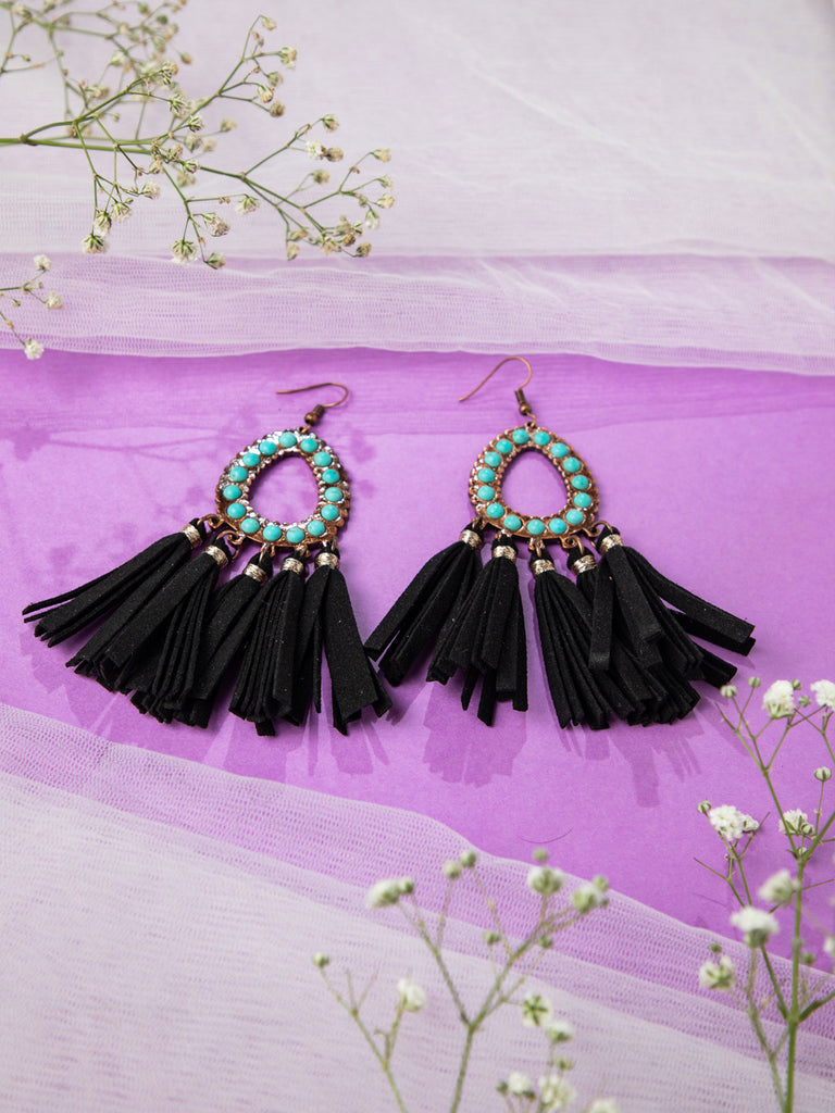 Bohemian Hanging Cyan Blue Beaded Earrings with Black RibbonsVendor: NisckaProduct Description Mesmerizing Bohemian earrings with cyan beads and black ribbons in a chic, modern design. Handcrafted by local artisans, they’re a must-have for parties, festivals, or functions—blending trendiness with artistic flair in a captivating, fresh style. Style & Tips Style with a flowy...