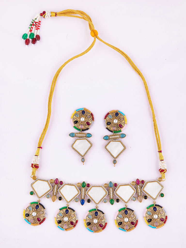 Brass Choker Necklace Set with Multicolor Stones and White Marble AccentsVendor: NisckaProduct Description Brass Choker Necklace Set featuring multicolor stones and white marble stones surrounded by white AD stones. Dangling brass coins with vibrant red, pink, white, black, blue, and cyan stones add charm. Paired with long matching earrings, perfect for party or function wear....