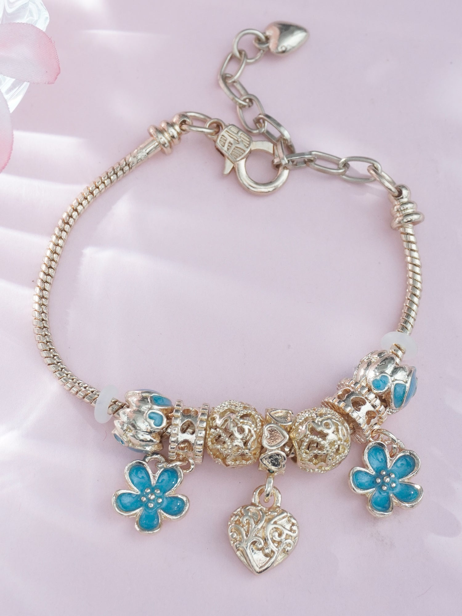 This gold-plated adjustable bracelet with blue heart and flower motifs is perfect for adding a playful touch to your outfits. For a casual daytime look, pair it with a simple white tee and high-waisted jeans to let the bracelet stand out. If you’re dressing up for a night out, wear it with a flowy dress in soft pastel shades to enhance the vibrant blue accents.