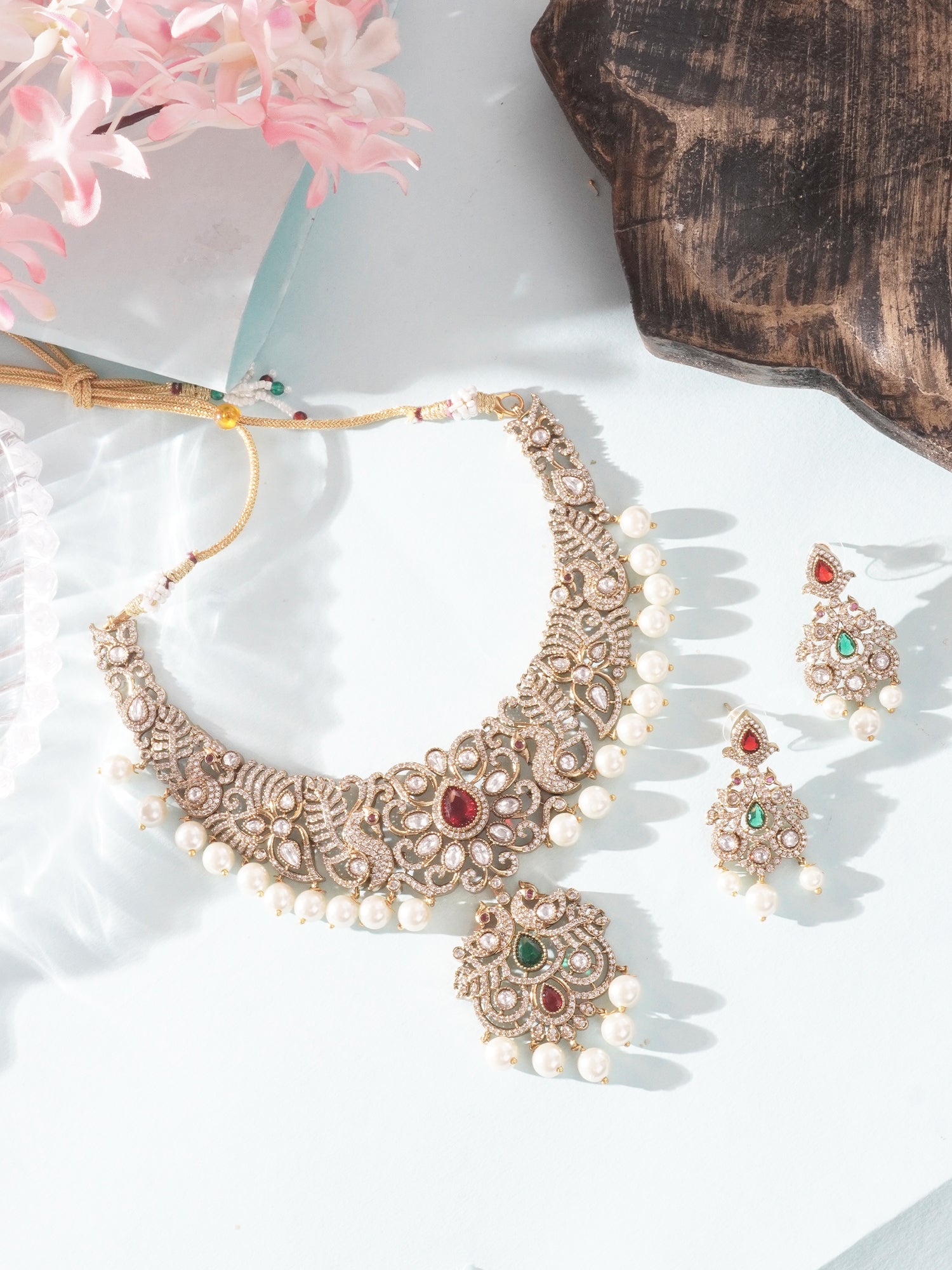 Celebrate elegance with Niscka's 24K gold plated jewelry set, featuring a stunning peacock design adorned with vibrant ruby and emerald stones. Accentuated by shimmering white American diamonds, this set radiates luxury and sophistication. Delicate pearls gracefully embellish every piece, enhancing the intricate craftsmanship with a soft, elegant touch. Perfect for weddings, festive occasions, or grand celebrations, this jewelry set combines timeless charm with artistic beauty, making it an exquisite addition to your collection.
