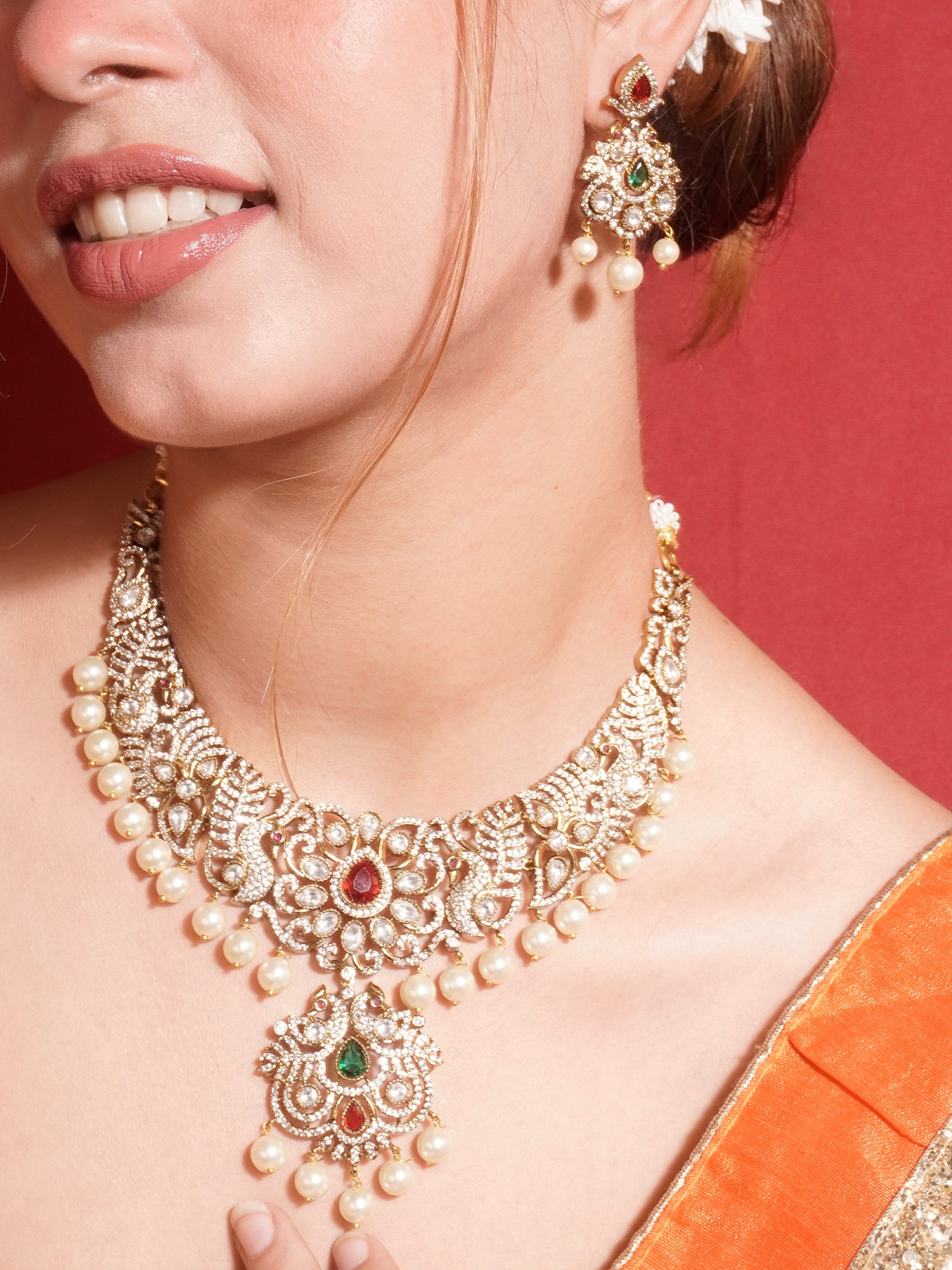 This floral jewelry set featuring ruby, emerald, and white American diamonds is perfect for making a statement at any event. For a sophisticated look, wear the set with an elegant off-the-shoulder or sweetheart neckline dress in a solid color, such as black or deep green, to let the vibrant gemstones stand out. Style your hair in soft curls or an elegant updo to draw attention to the intricate details of the jewelry. Opt for a fresh makeup look with soft, natural tones and a pop of color on the lips that complements the rubies and emeralds.