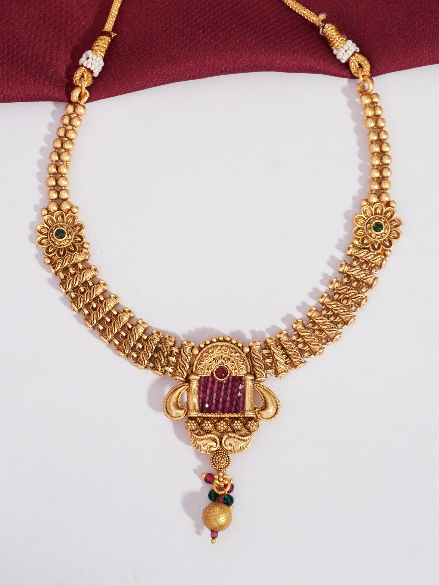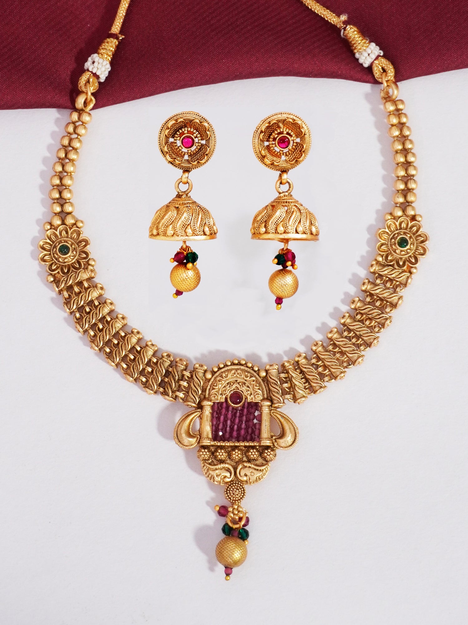 This exquisite 24k gold-plated jewelry set blends the timeless beauty of ruby and emerald stones with the elegance of traditional design. The set features a stunning bell design, adding a unique charm that elevates the vibrant colors of the gemstones. Perfect for weddings, festivals, or any special occasion, this jewelry set offers a regal and sophisticated touch to your traditional attire. The rich hues of ruby and emerald, combined with the luxurious 24k gold plating, make this set a must-have addition to your collection.