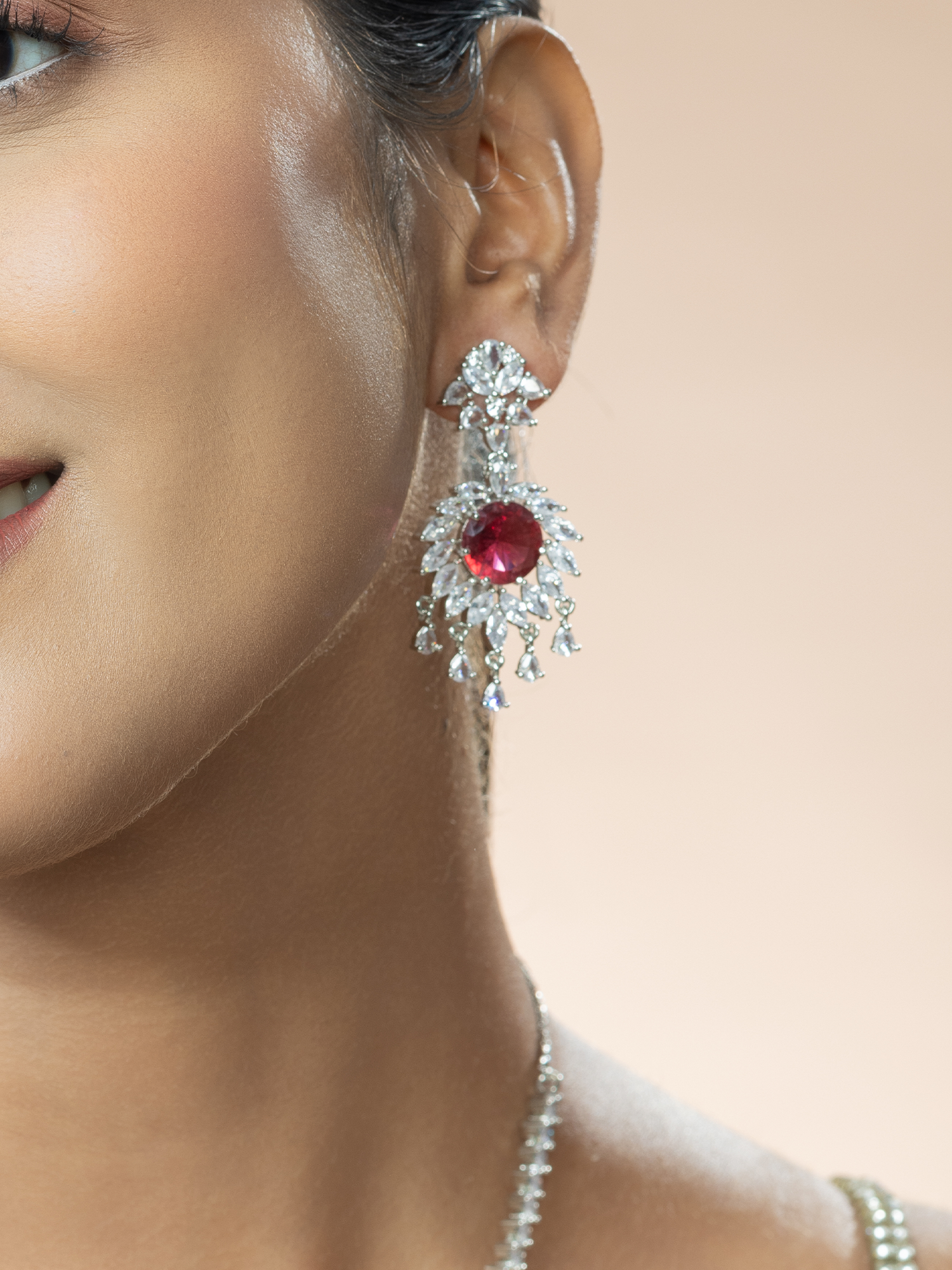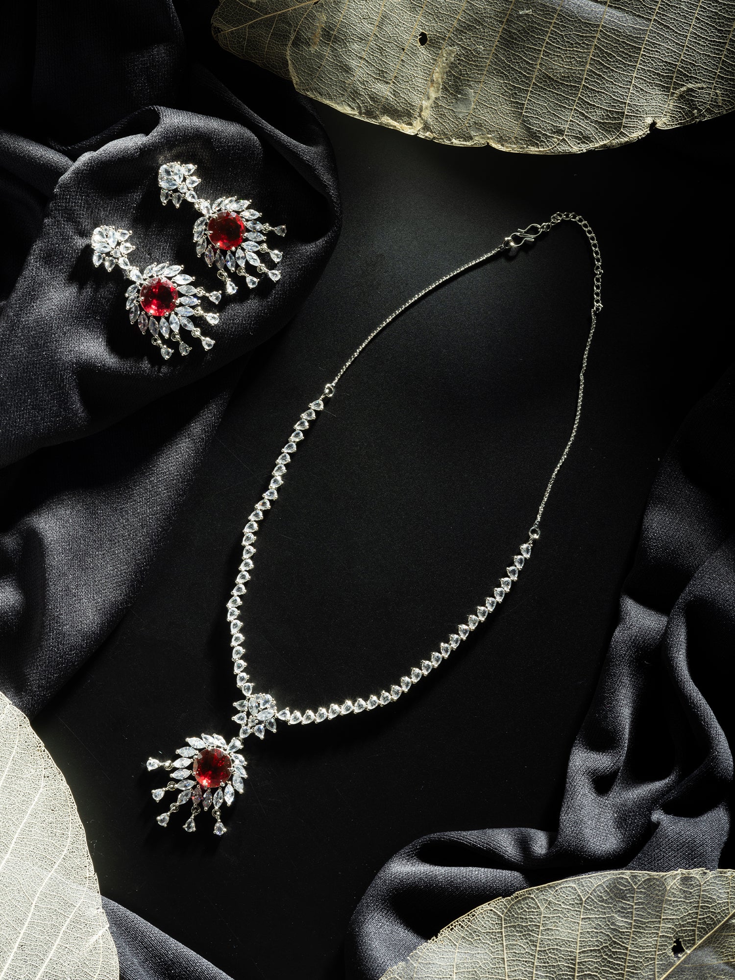Elevate your style with our exquisite American Diamond Necklace with Earrings Set, a symbol of glamour and sophistication. Immerse yourself in the Latest Design featuring AAA+ Grade Crimson Red Zircon Stones. The silver polish with Rhodium plating adds a fashionable allure, making this ensemble a must-have for those who appreciate both timeless elegance and contemporary flair. Showcase the allure of our American Diamond Necklace with Earrings Set by pairing it with a sleek, monochromatic outfit. Let the AAA+ Grade Crimson Red Zircon Stones shine against the silver polish with Rhodium plating, ensuring a chic and fashionable statement for any occasion.