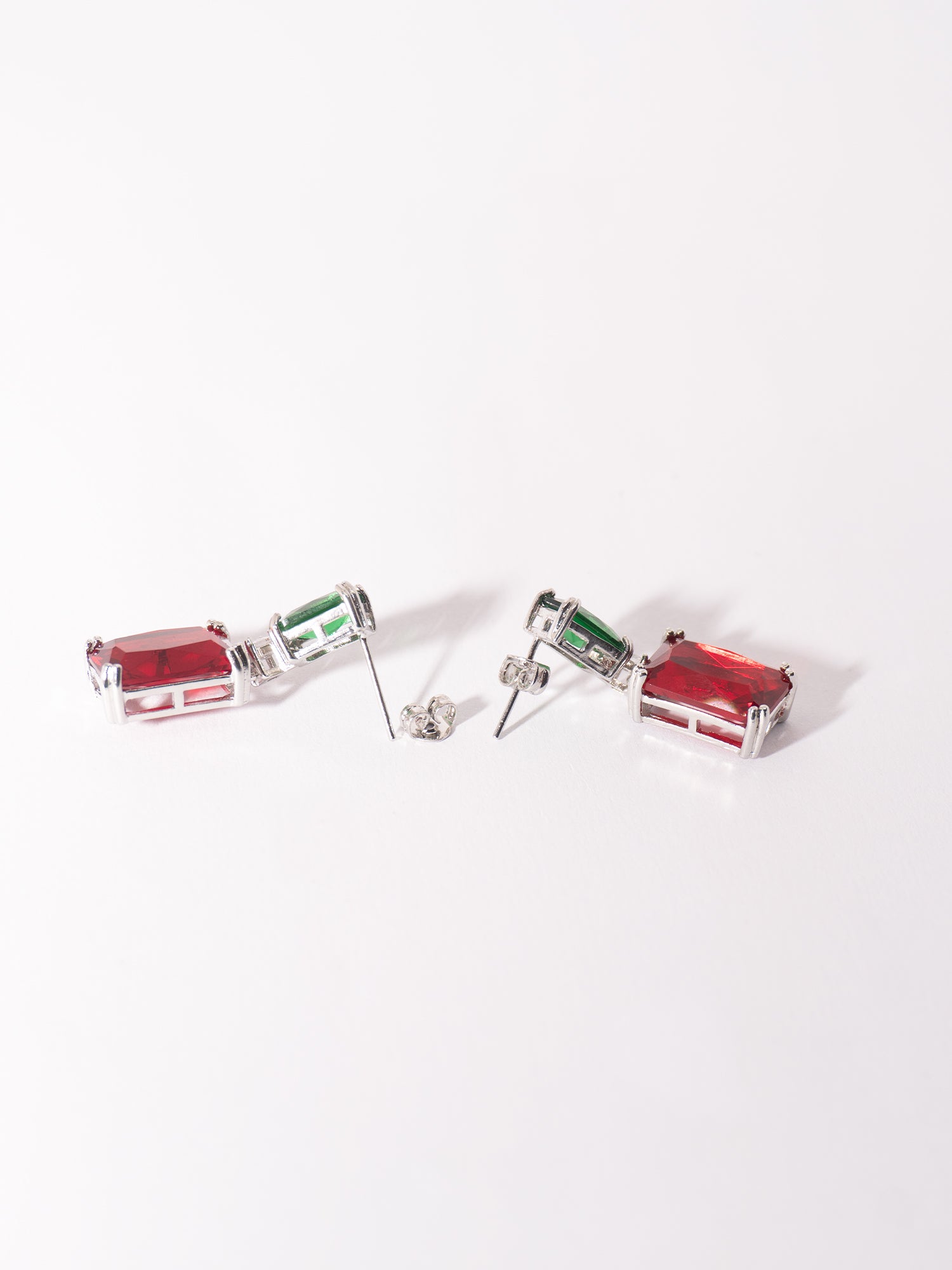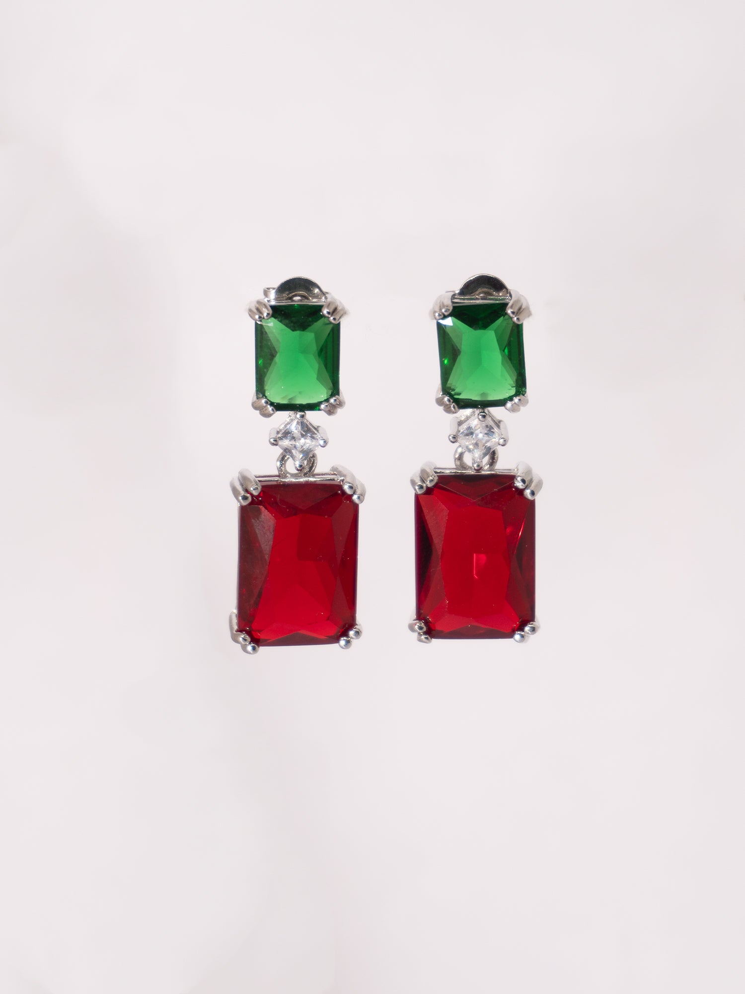 Add a touch of regal elegance to your ensemble with Niscka's exquisite earrings, featuring a brilliant combination of ruby, emerald, and sparkling American Diamonds. Crafted with a Rhodium-Polished finish, these earrings exude a sleek, refined shine that enhances the vibrant hues of the gemstones. Whether for a special occasion or an evening out, this stunning pair offers timeless sophistication and unmatched brilliance.