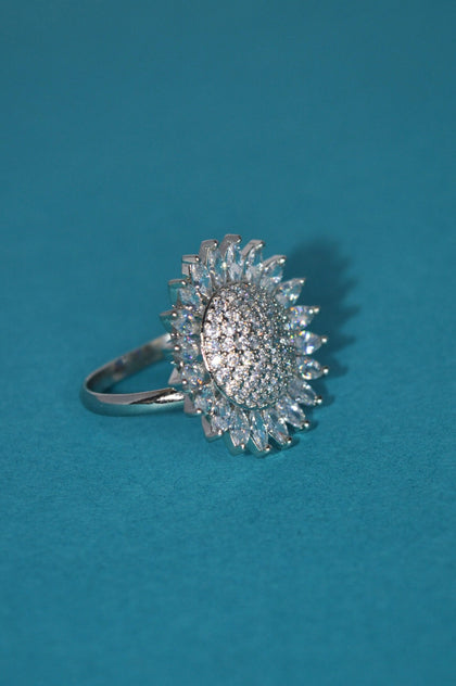 Rhodium Plated White American Diamond Solitaire RingVendor: NisckaMesmerising rhodium-plated ring featuring a large white American Diamond solitaire at the center, surrounded by sparkling AD stones. Handcrafted by skilled artisans, elegant and eye-catching, perfect for parties, festivals, and grand festive occasions.