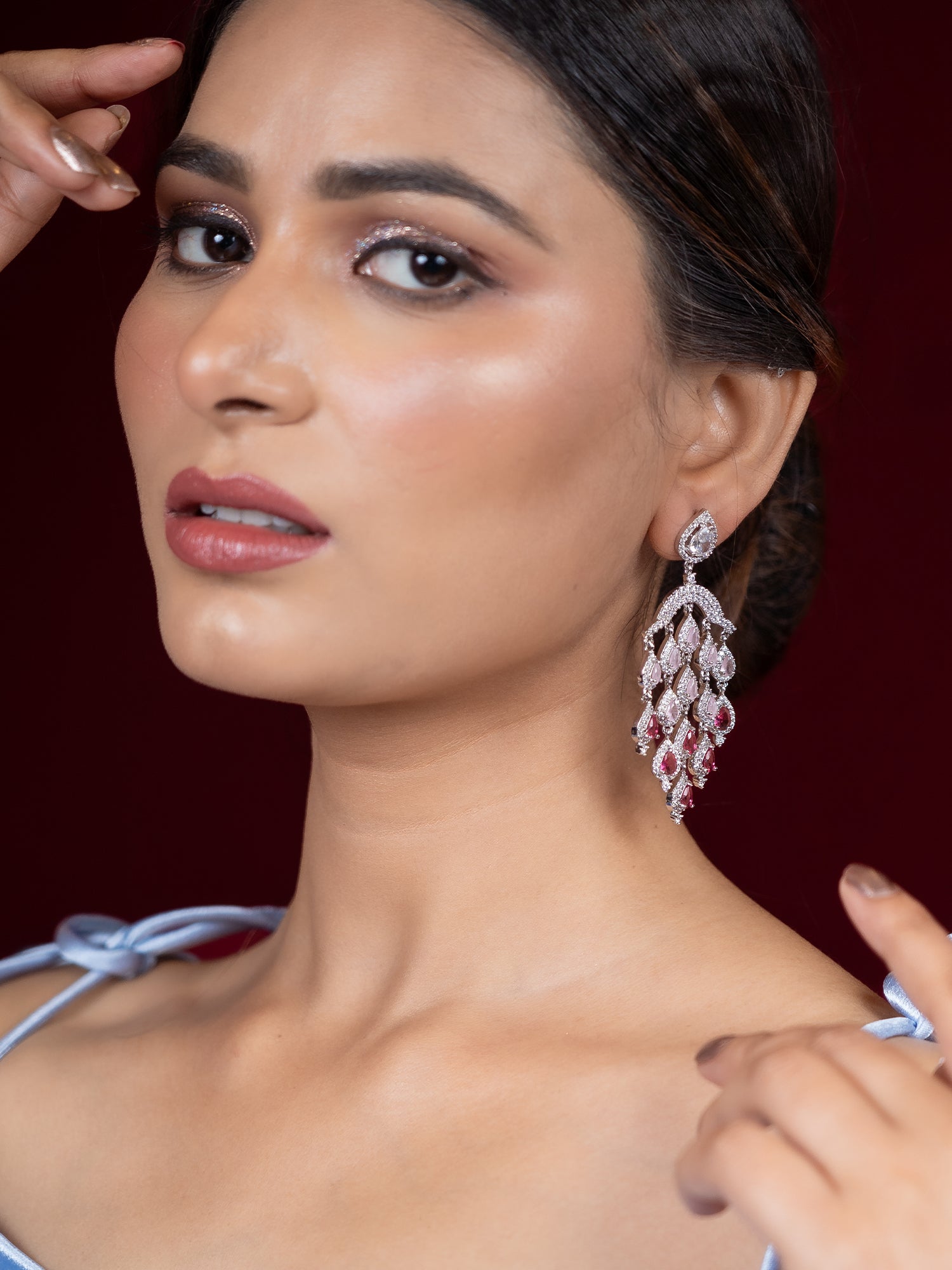 For a sophisticated and timeless look, pair these American diamond and zircon drop earrings with a sleek, elegant evening gown or a tailored dress in classic shades like black, navy, or deep emerald. The shimmer from the stones will beautifully enhance the simplicity of a solid-colored outfit. Style your hair in a chic updo or soft curls to highlight the earrings, and opt for a glowing makeup look with a bold lip to complete the ensemble. These earrings are perfect for weddings, galas, or any formal event where you want to shine.