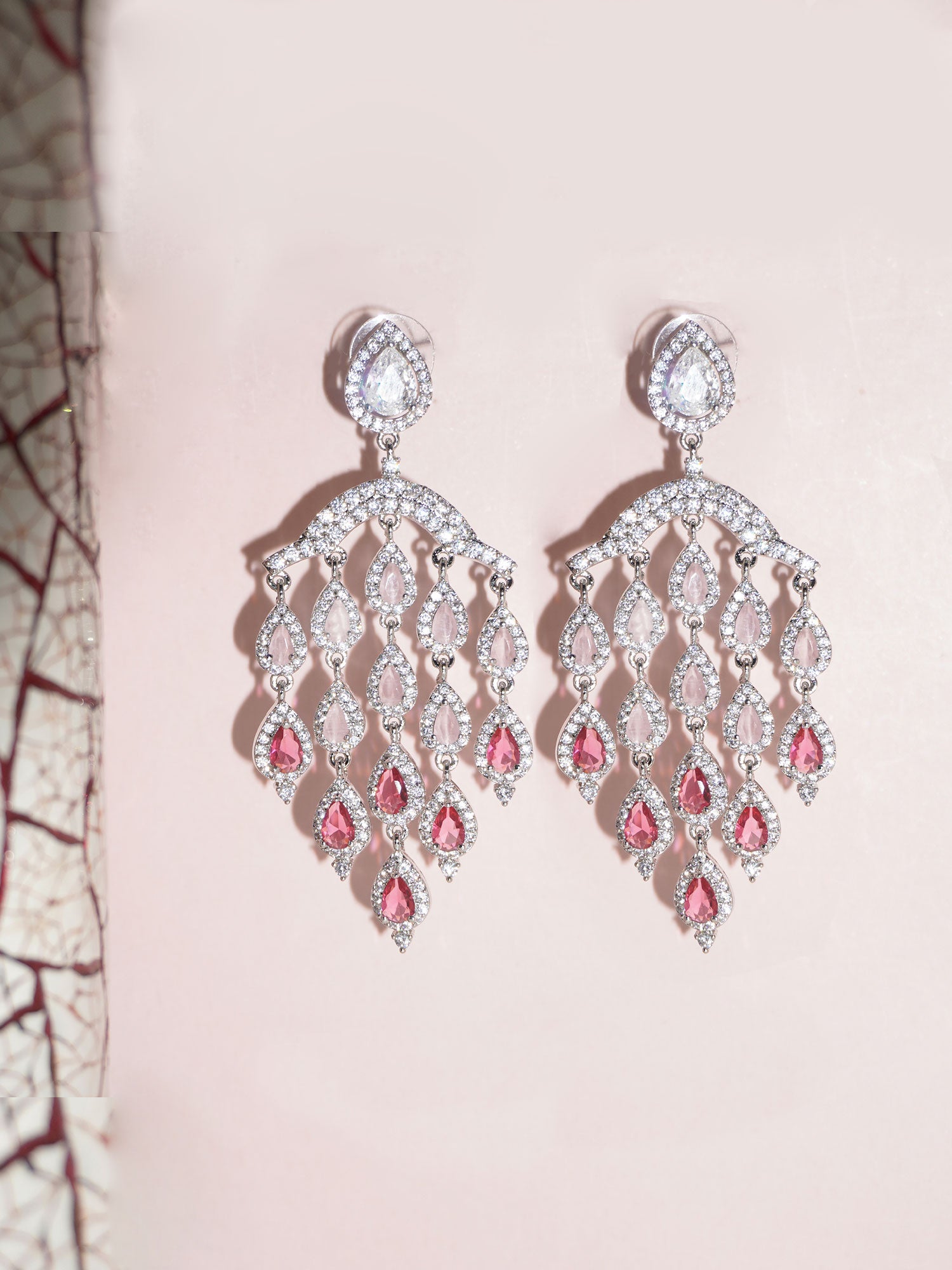These stunning earrings feature a glamorous drop design, perfect for adding elegance to any occasion. Crafted with rhodium plating for a durable, tarnish-resistant finish, the earrings are adorned with sparkling American diamonds and dazzling zircon stones. The intricate arrangement of these stones creates a beautiful shimmer that catches the light from every angle, making these earrings an eye-catching addition to your jewelry collection. Whether you're dressing up for a special event or an evening out, these drop earrings will add the perfect touch of sophistication and sparkle to your look.