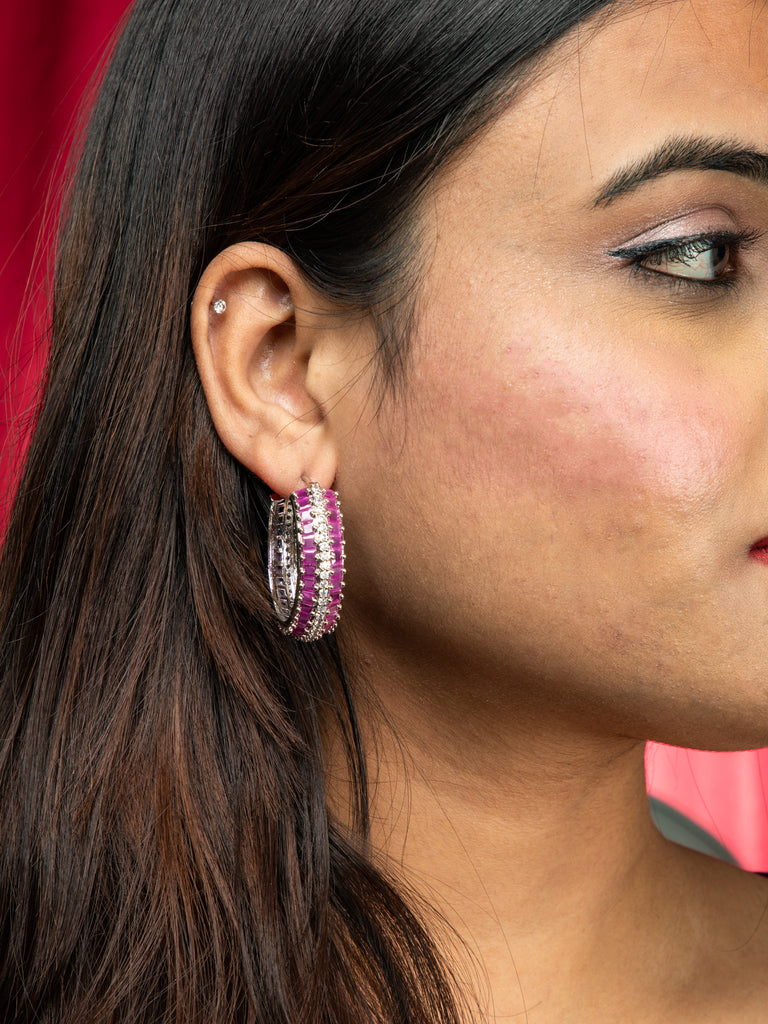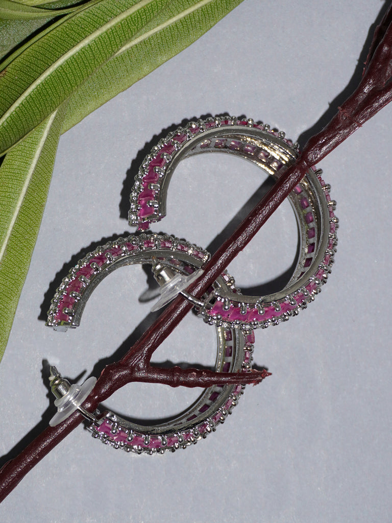 Silver Rhodium Round Hoop Earrings with Pink and White American Diamond StonesVendor: NisckaProduct Description Rhodium-plated large round hoop earrings featuring a stunning pattern of white and magenta American diamond stones. Handcrafted by local artisans, this mesmerizing, modern design is a must-have for parties, festivals, or functions, adding glamour to any occasion. Style & Tips Pair with...