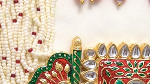 24K Gold Plated Triple Layered Pearl Necklace Set with EarringsVendor: NisckaProduct Description Handcrafted by local artisans, this 24K gold-plated triple-layered necklace set features white faux pearls with a pendant adorned with red, green, and white CZ stones. Matching earrings complete the look—perfect for parties, festivals, or functions, adding timeless elegance. Style & Tips Pair...