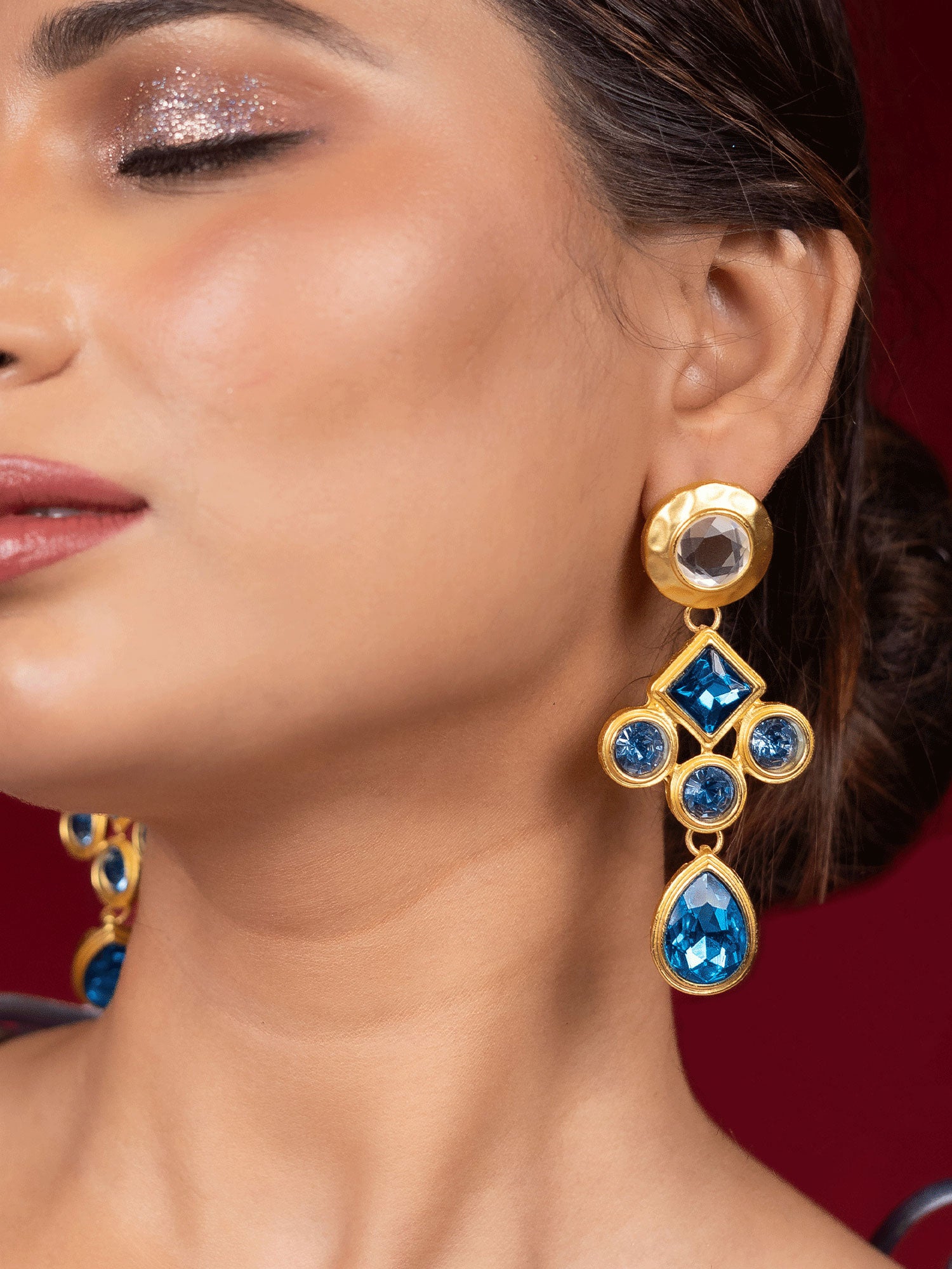 Pair these gold-plated blue drop earrings with a navy or white outfit to enhance their striking contrast. Opt for a sleek ponytail or soft curls to showcase their elegance, and complement the look with a delicate gold bracelet or a matching blue stone ring for a refined, coordinated appeal.