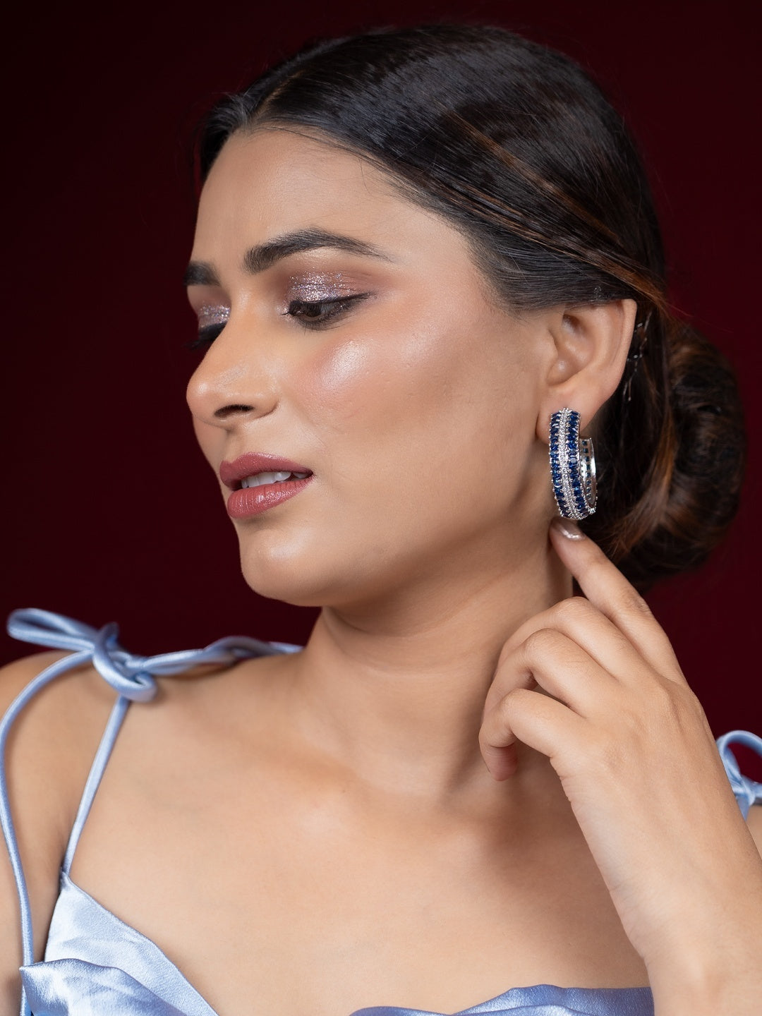 Pair these rhodium-plated earrings with blue stones, American diamonds, and zircon with a deep blue or navy gown to complement the vibrant blue stones. For a traditional look, wear them with a saree or lehenga in a contrasting color like silver or white to let the earrings shine. Keep your makeup soft with a bold lip to create a sophisticated and balanced look. Perfect for evening events and festive occasions!