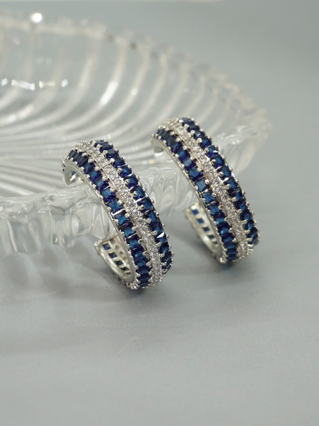 Elevate your look with these exquisite rhodium-plated earrings, featuring vibrant blue stones, dazzling American diamonds, and shimmering zircon accents. The elegant design combines modern sophistication with timeless charm, making these earrings a standout piece for any occasion.