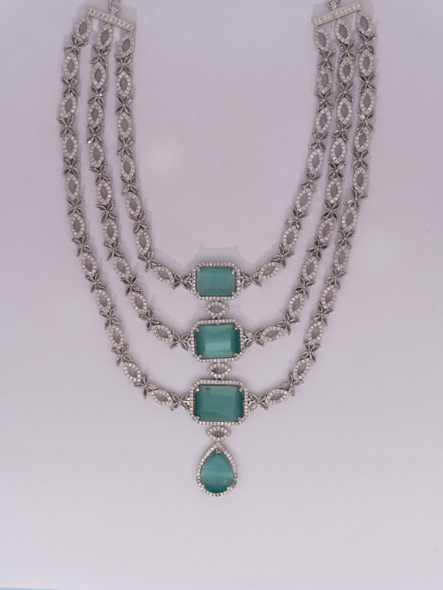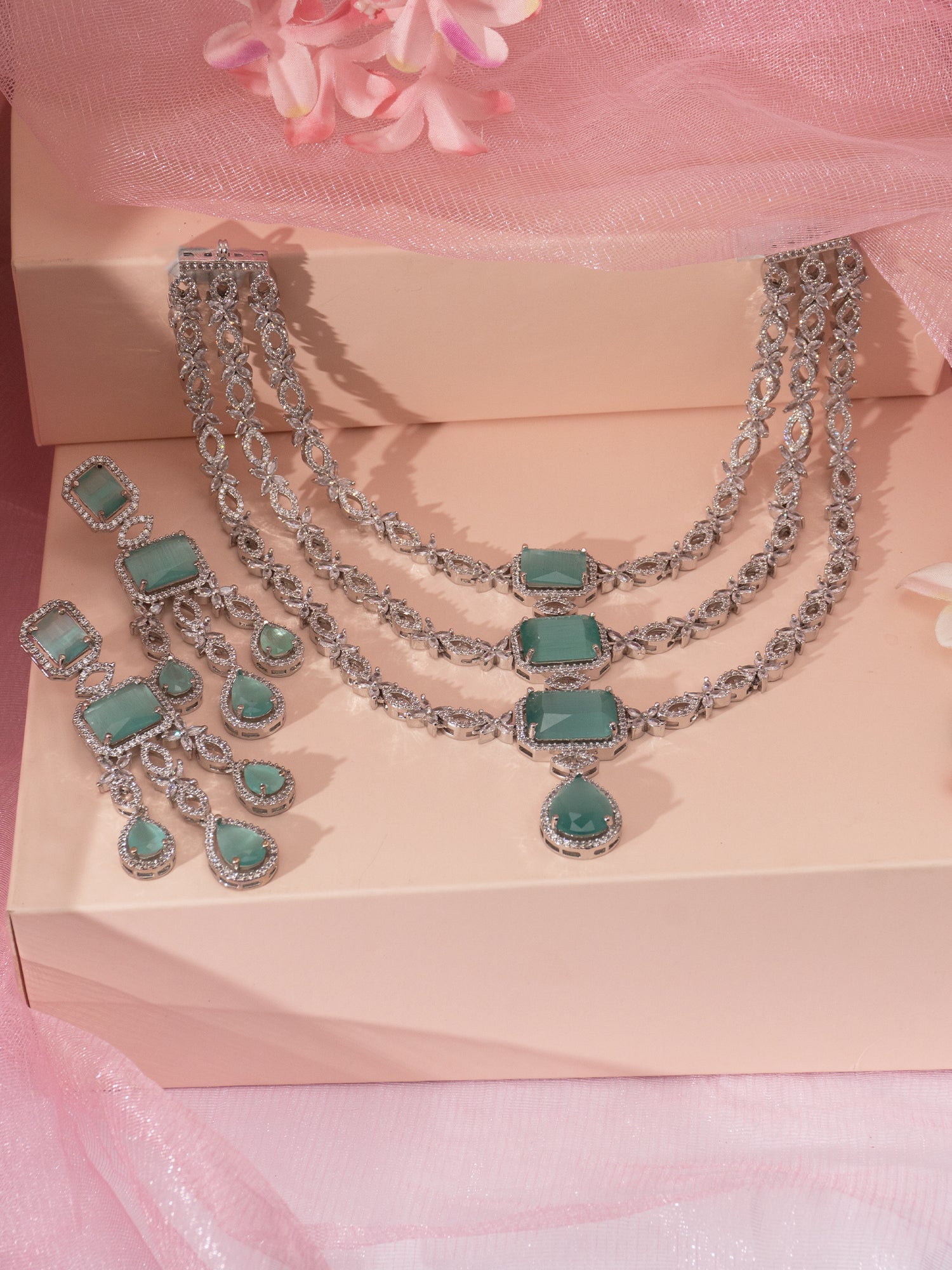 To highlight the Niscka Galaxy Mint Green Layered Jewelry Set, pair it with a sleek, neutral-toned outfit such as a white or beige dress to let the mint green stand out. A clean, sophisticated hairstyle like a polished bun or soft waves will enhance the set’s contemporary charm, ensuring you look effortlessly stylish and refined.