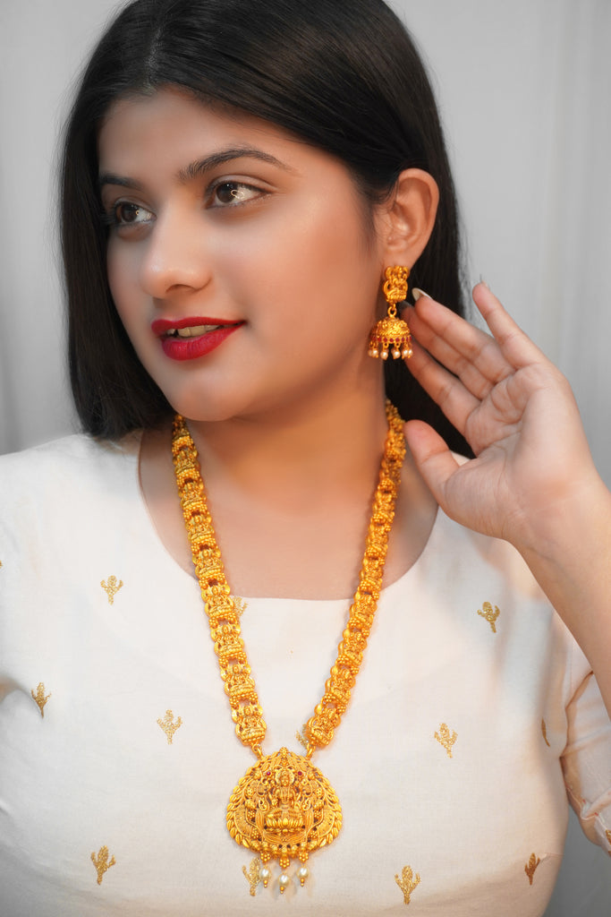 Gold Plated Ruby, Emerald, and Pearl Necklace Set with EarringsVendor: NisckaProduct Description Introducing our captivating Gold Plated Ruby, Emerald, and Pearl Necklace set with Earrings, a masterpiece of elegance and grace. The spellbinding design, adorned with white and green stones and multiple hanging pearls, exudes sophistication. Enhanced by a multilayer small white pearl chain,...