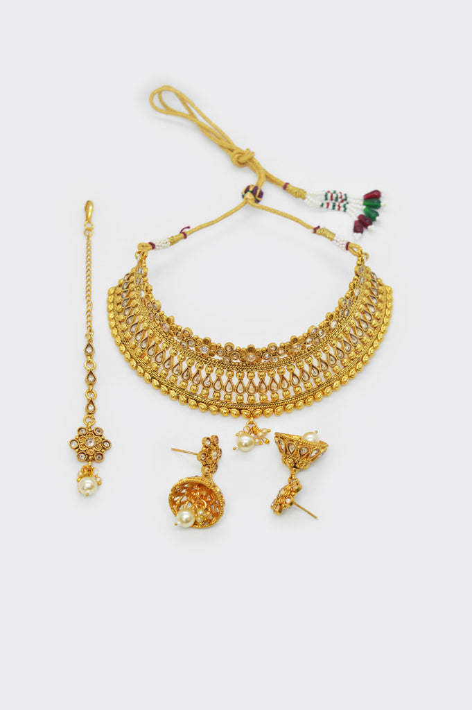 Ethnic 24K Gold-Plated Golden Beads and Ruby Choker SetVendor: NisckaProduct Description Enhance your look with Niscka's 24K Gold-Plated Pearl Choker Necklace Set. This elegant set features a luxurious 24K gold-plated choker adorned with lustrous pink stone and delicate moti dori details. Ideal for adding a touch of classic sophistication to any special occasion....