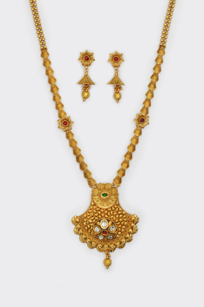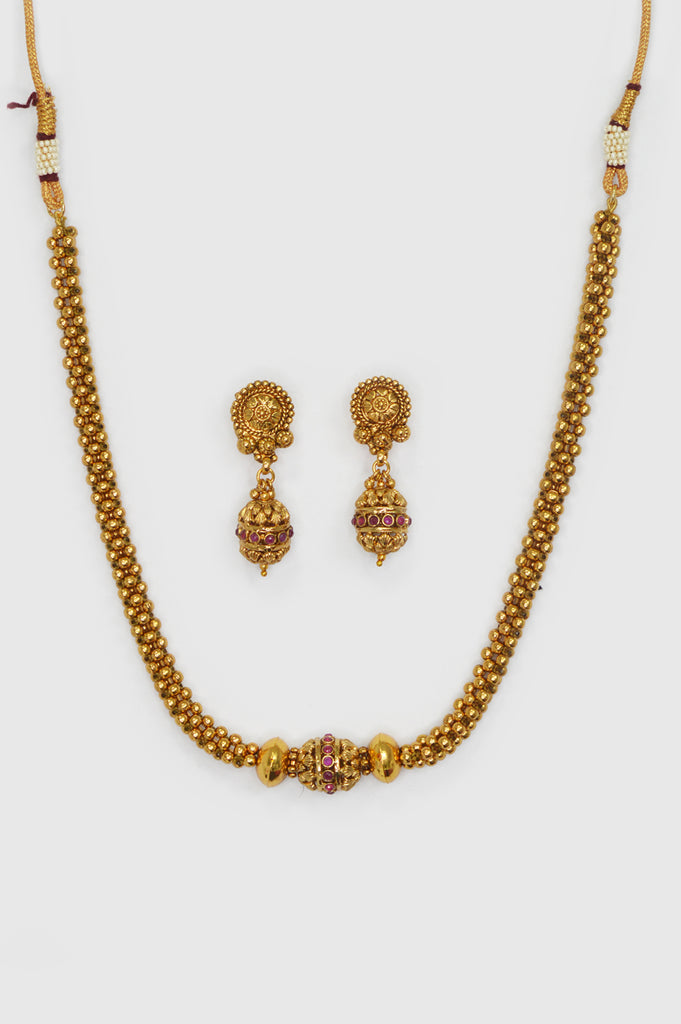 24K Gold-Plated Antique Ruby Necklace Set with EarringsVendor: NisckaProduct Description Enhance your style with exquisite American diamond & stone necklace and earring set from Niscka. This piece is crafted with high quality silver brass material The necklace and a pair of earrings offer a stunning combination of beauty and refinement. Perfect for...