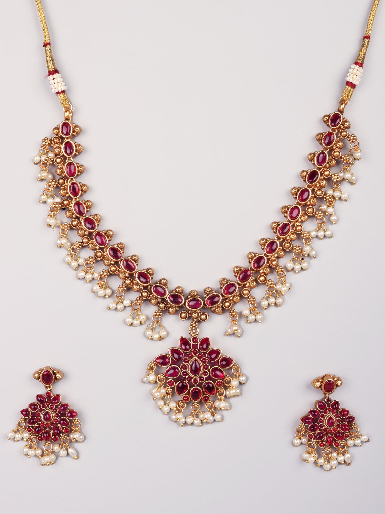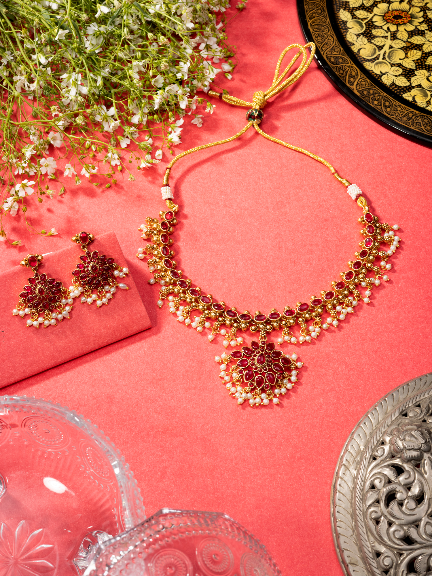 24K Gold-Plated Ruby & Pearl Necklace Set with Earrings