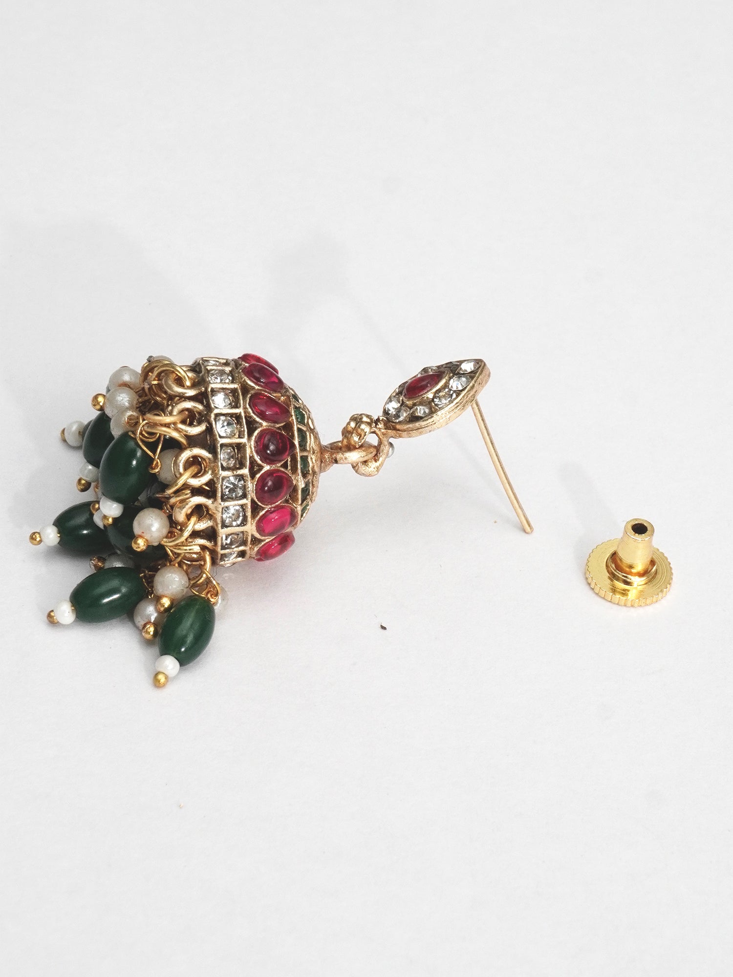 Emerald and Pink Gold-Plated Jewelry Set with American Diamond Rhodium-Plated Finish and Jhumki Earrings