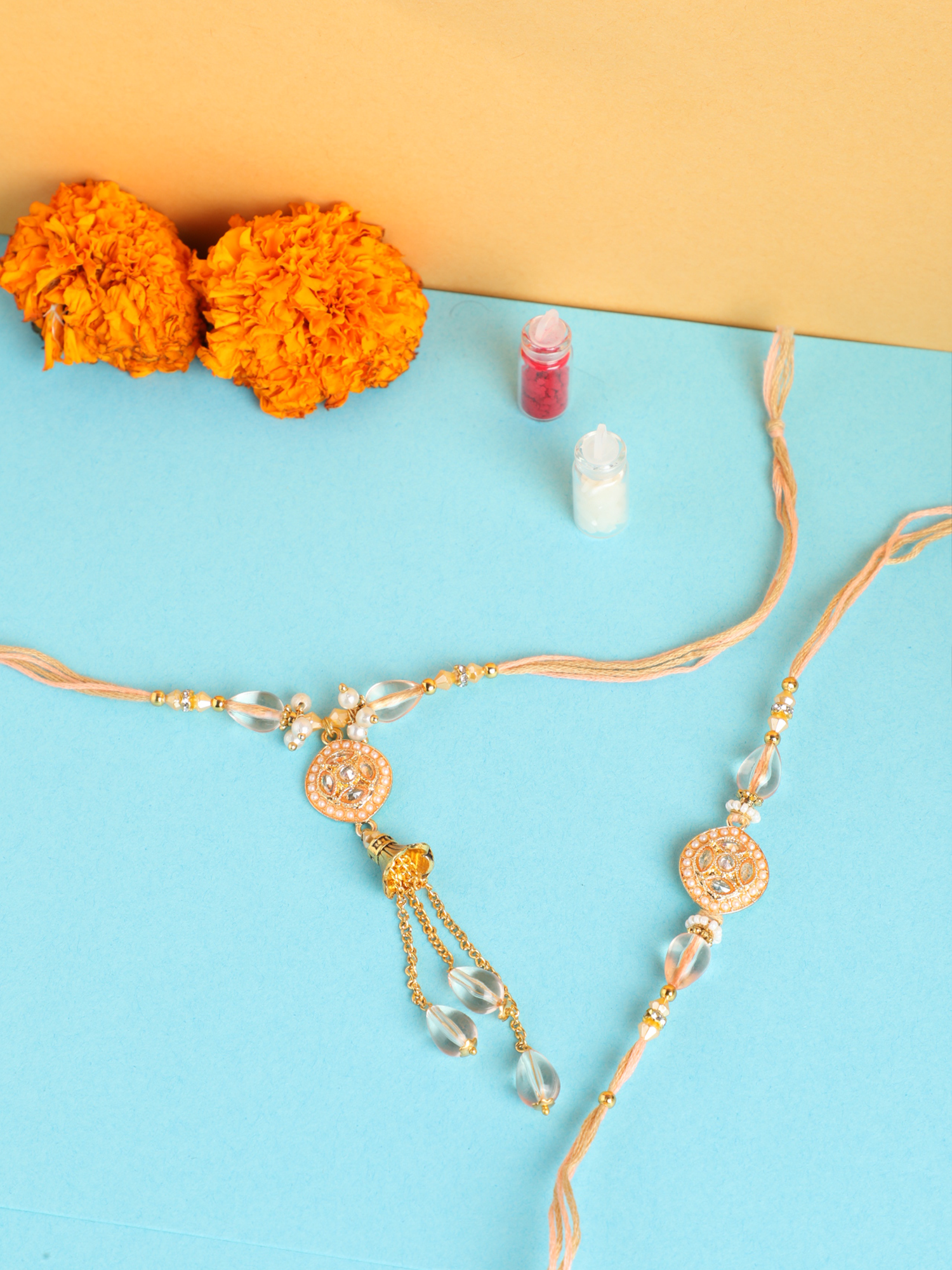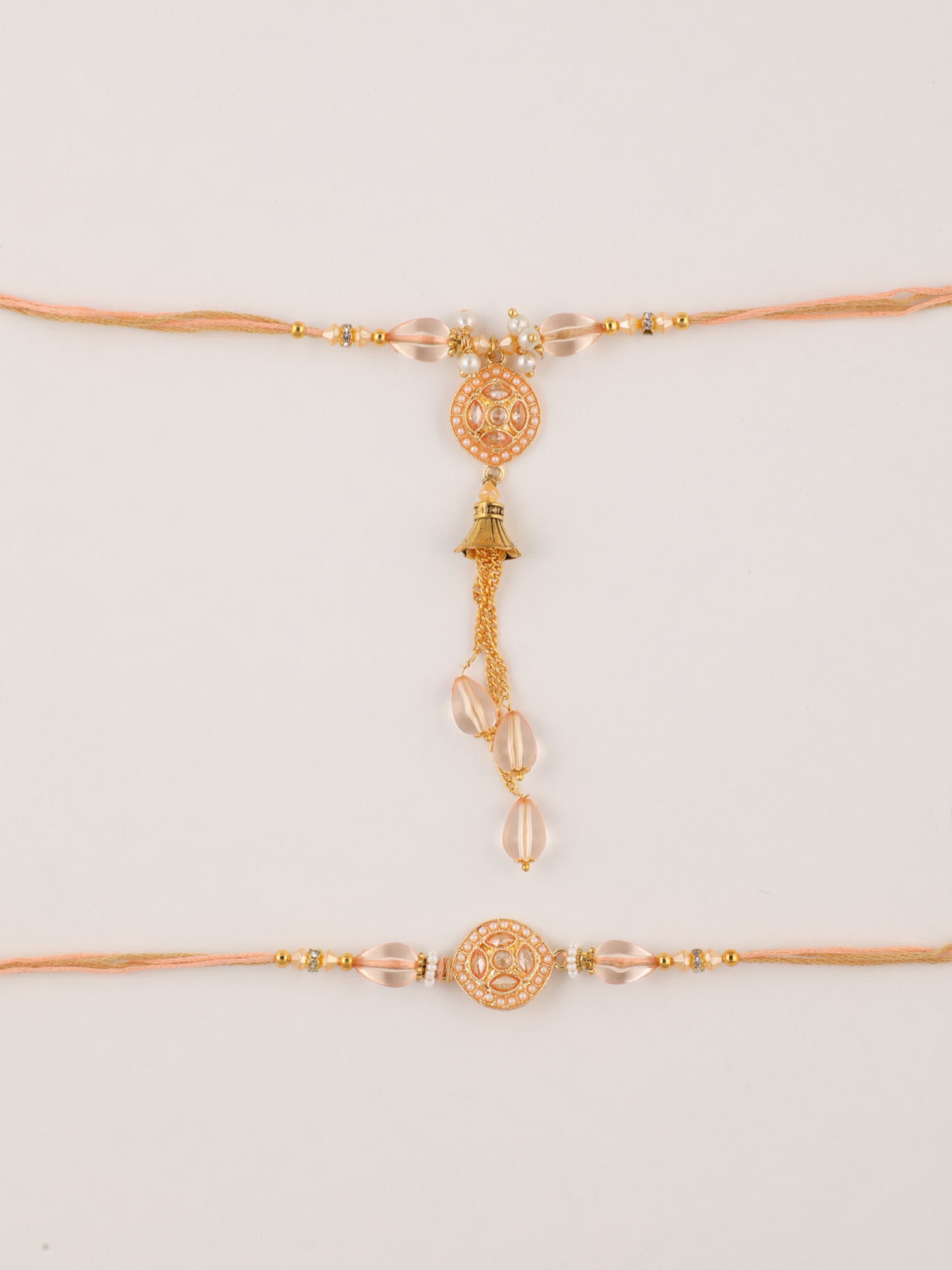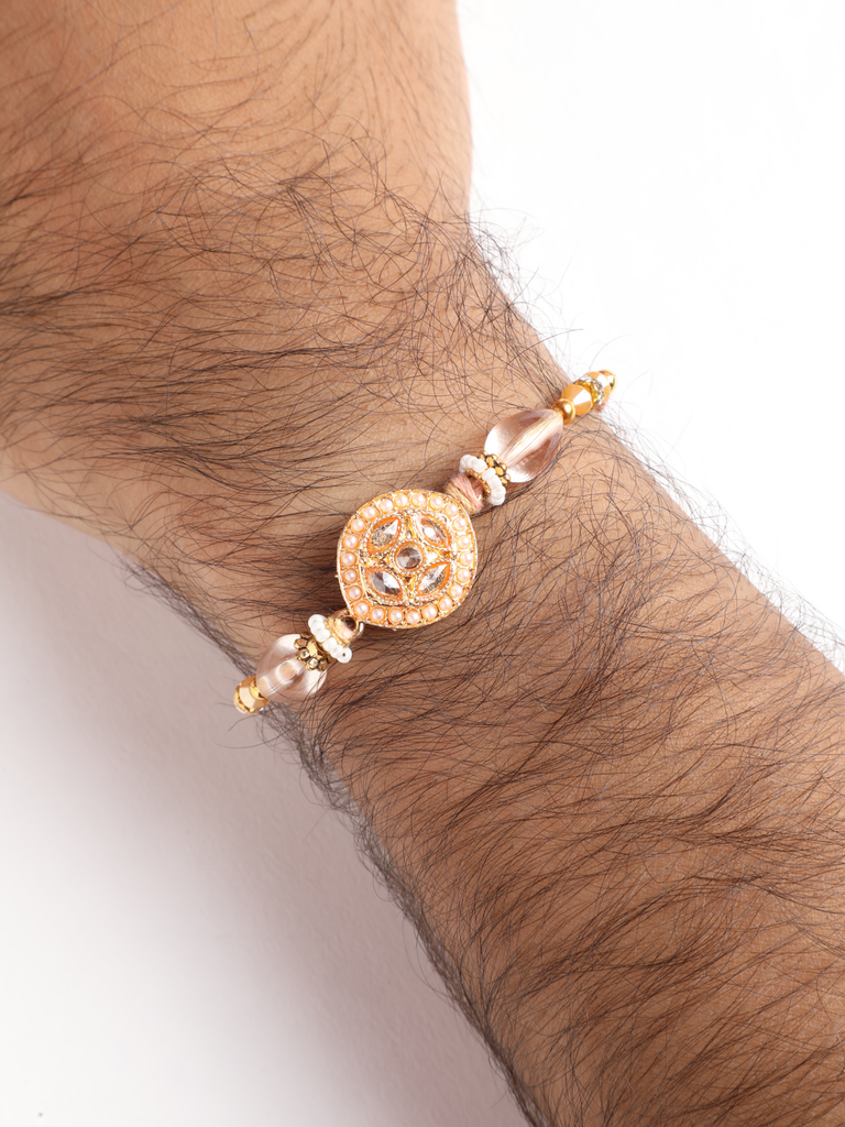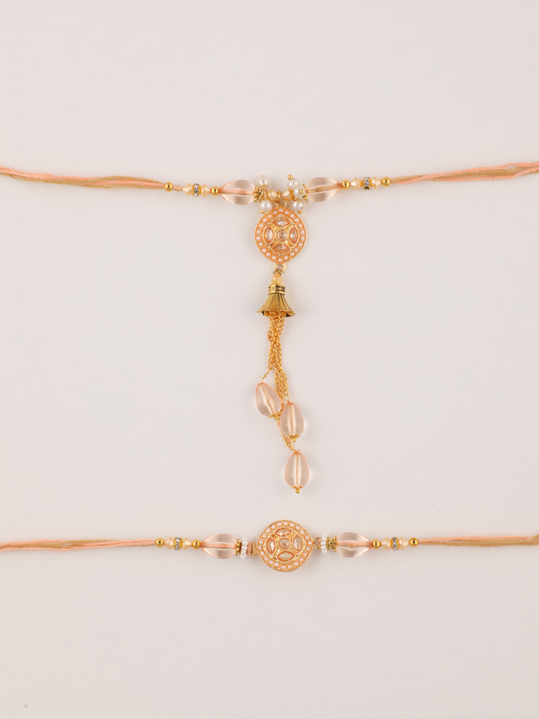 Rakshabandhan is a beautiful festival which is celebrated all over India with lots of joy and happiness. This is the time for a get together celebration with your siblings and close once. Let’s celebrate this unbreakable bond with Niscka Rakhi.This rakhi set features a rakhi with Cz stones and pearl studded in it. For bhabhi this is a traditional gold plated brass rakhi and has bells hangings. These Rakhis are adjustable in size.