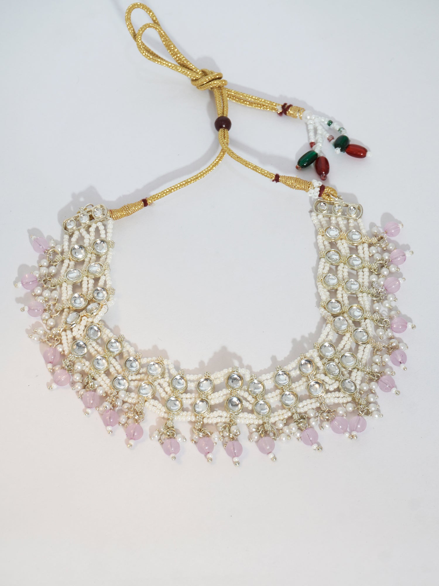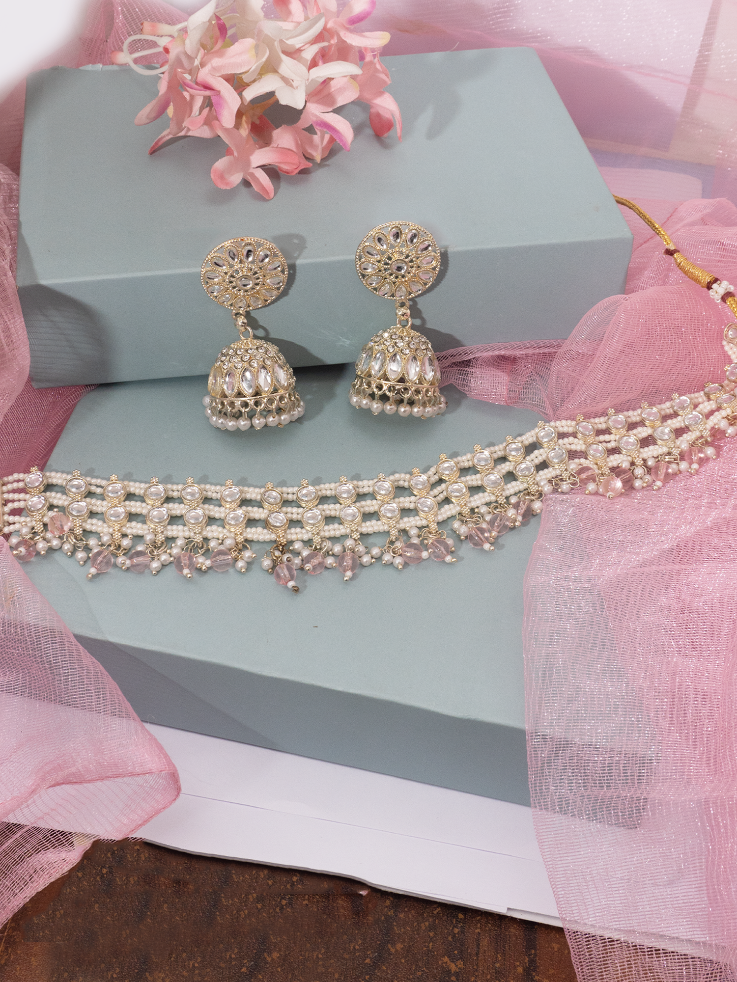 To highlight Niscka's 18k Gold and Pink Kundan Water Drop Jewelry Set, pair it with a classic or elegant outfit that complements the vibrant pink stones. Opt for a saree or lehenga in soft pastels, ivory, or a matching pink to create a cohesive and striking look. For a polished appearance, style your hair in a smooth updo or soft waves, allowing the jewelry to shine.