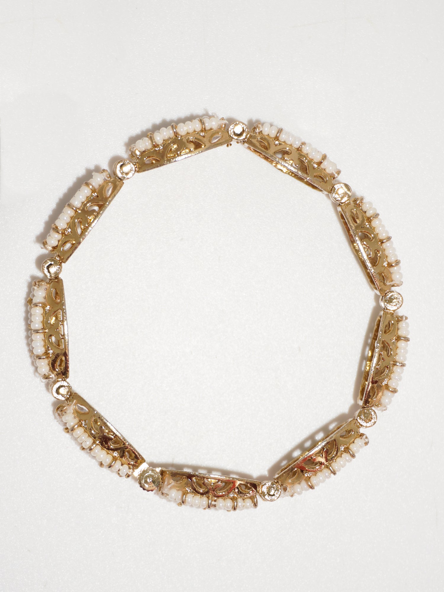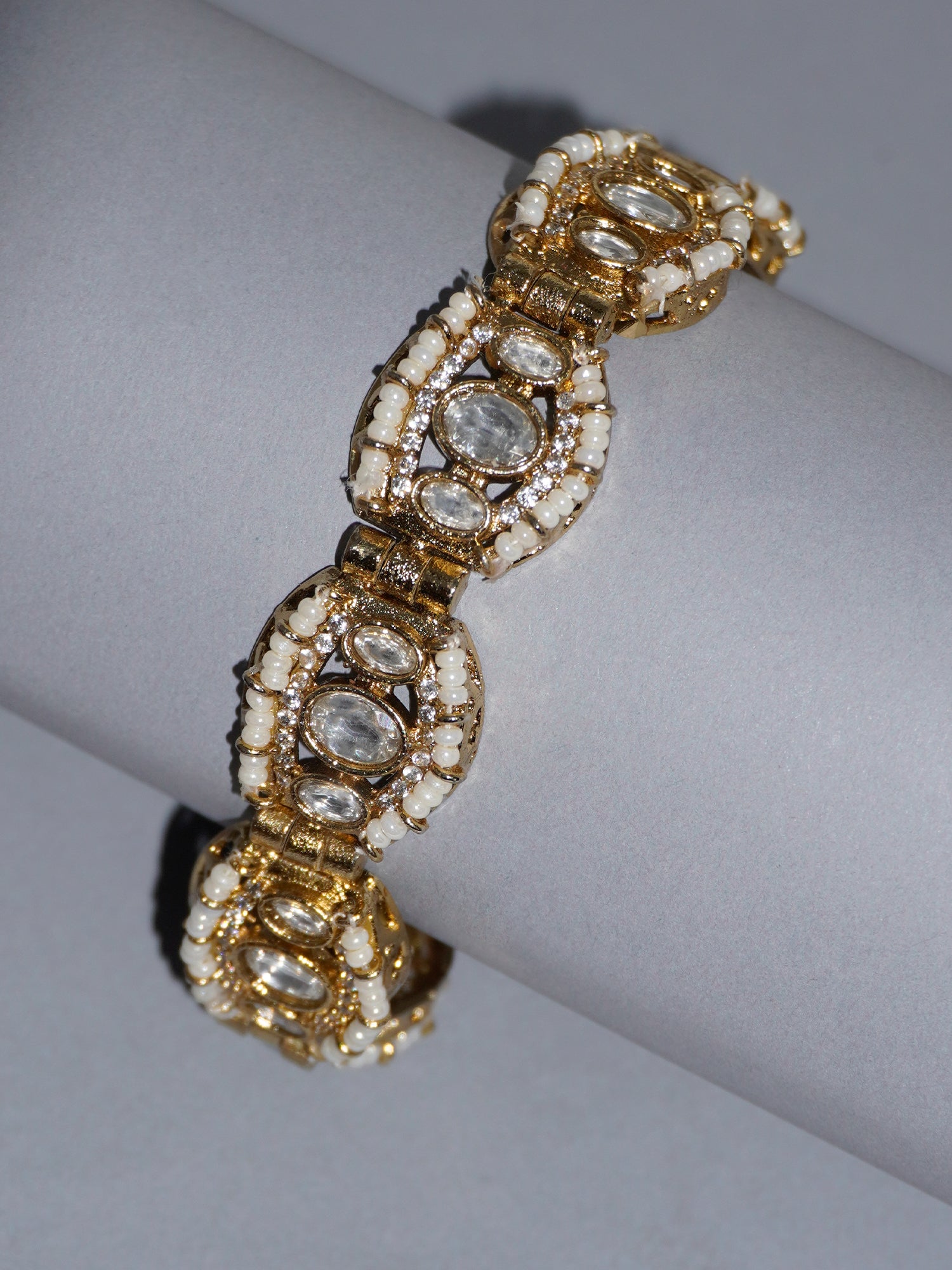 Handcrafted by local artisans, this 22K gold-plated matte finish bracelet features an elegant interlock pattern with white faux pearls and kundan stones. A must-have accessory for festive, party, or function wear, offering timeless charm and gorgeous design.
