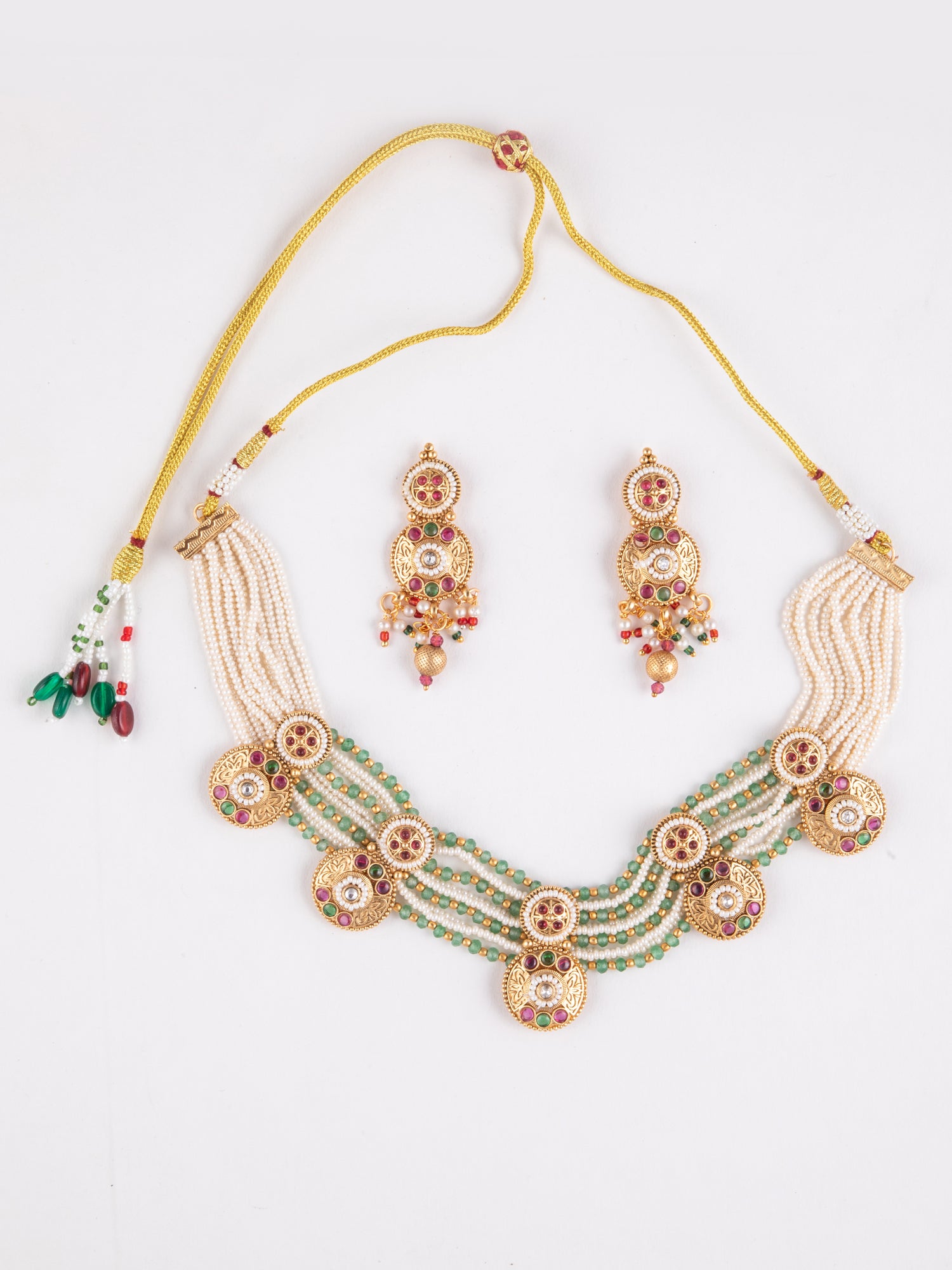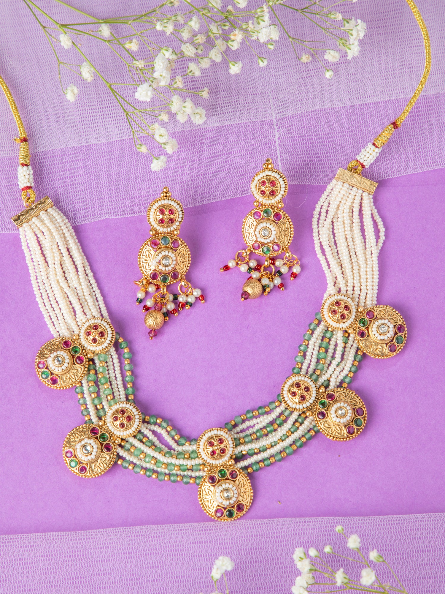 Embrace tradition with this pearl and gold plated coin necklace set, featuring green gold bead and faux pearl chains. Intricately carved coins are adorned with red and green stones. Includes matching earrings.