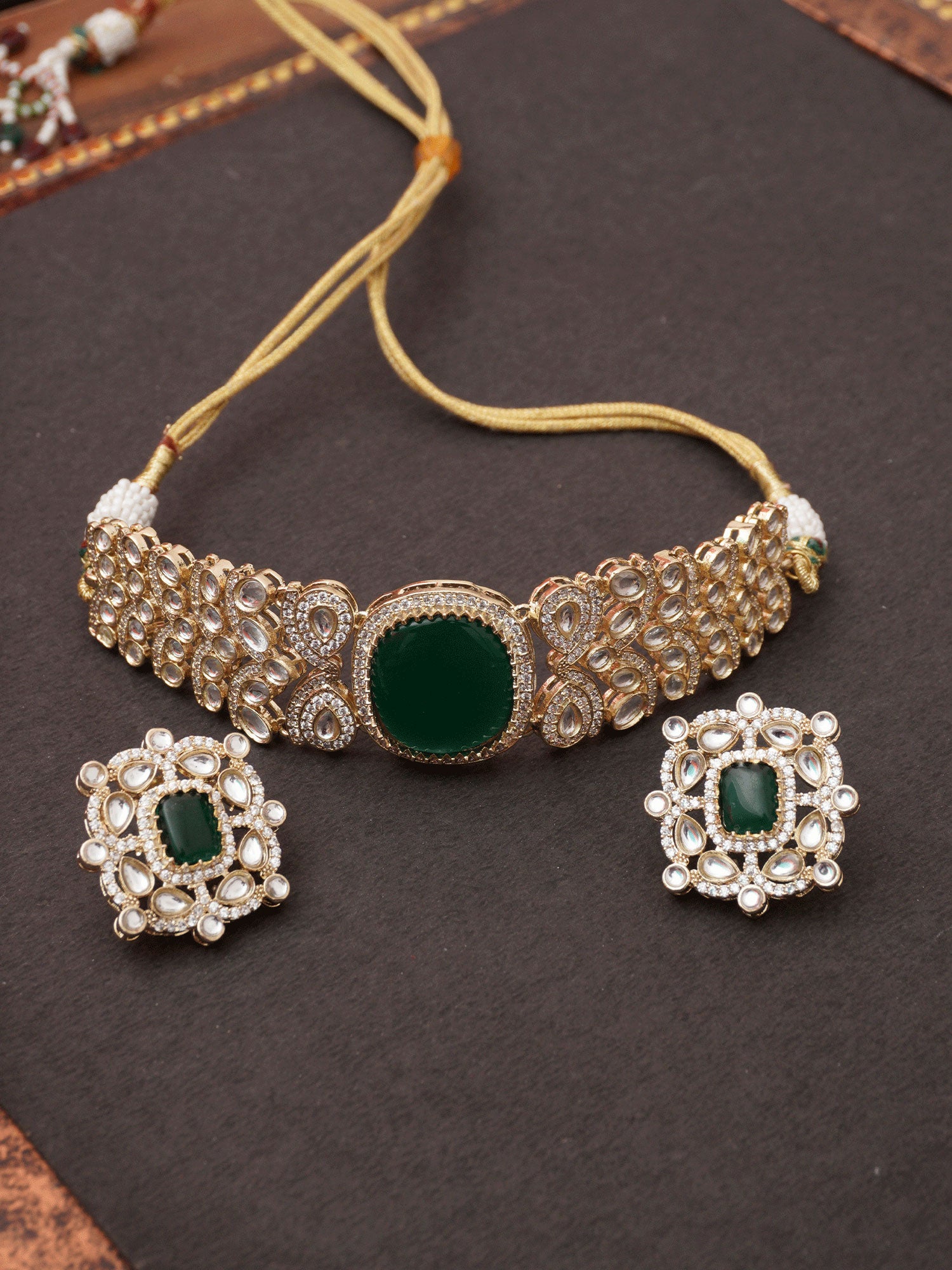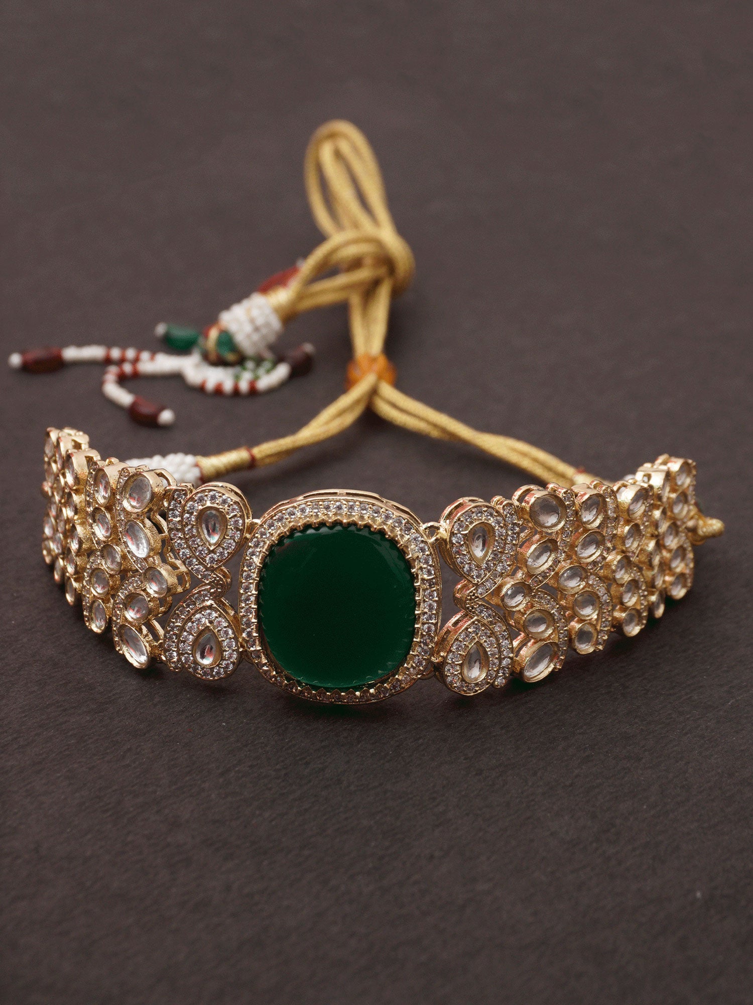 Embrace timeless elegance with this stunning 24K gold-plated traditional jewelry set, featuring rich emerald stones that radiate beauty and sophistication. The set includes a delicately crafted necklace, matching earrings, and a bracelet, all adorned with vibrant emeralds that add a pop of color and luxury. Perfect for weddings, special occasions, or cultural celebrations, this jewelry set combines classic design with modern glamour. The 24K gold plating ensures a radiant finish, while the emeralds bring a touch of regal charm to any ensemble. Elevate your style with this exquisite traditional set, made to be treasured for years to come.