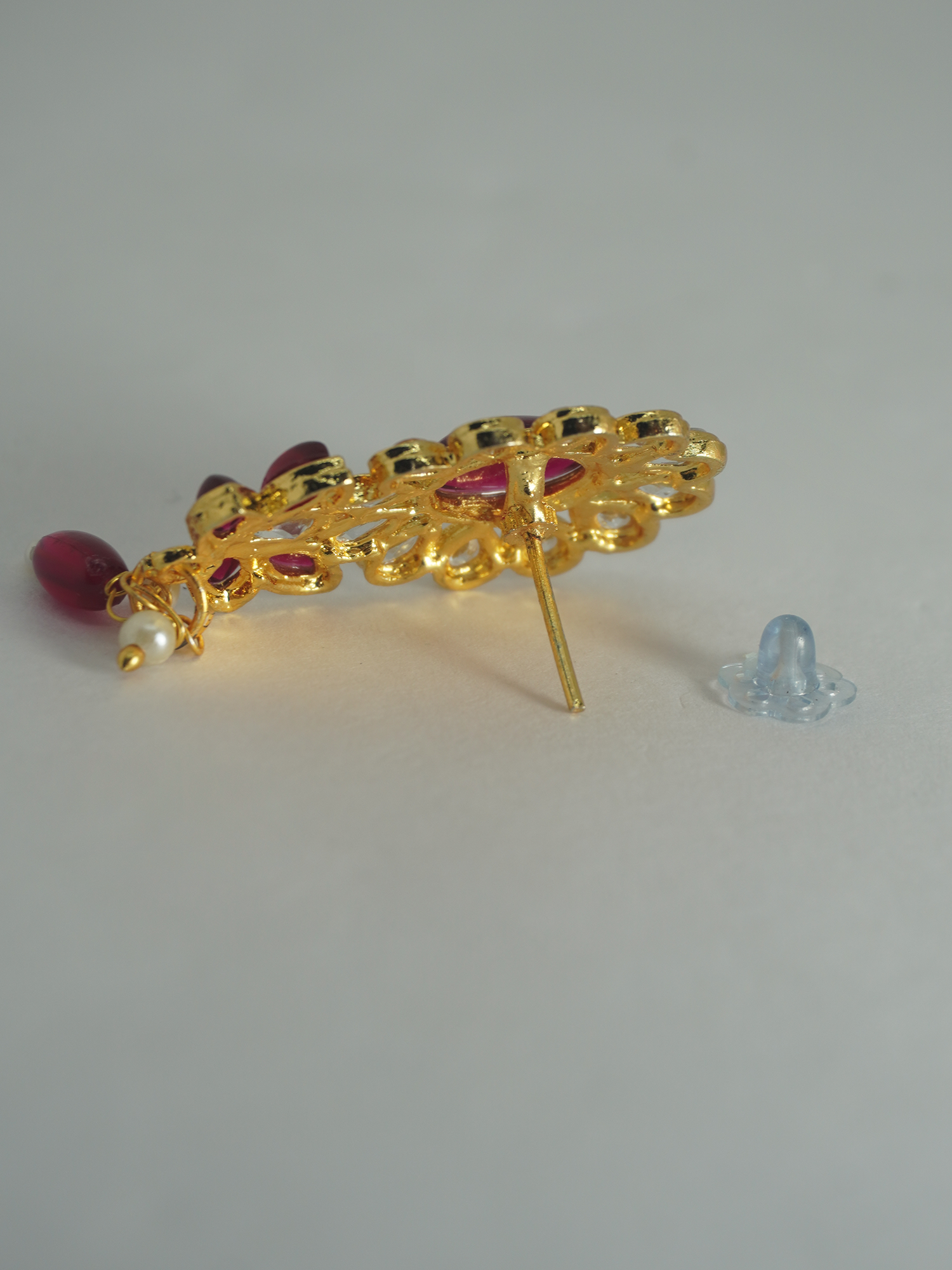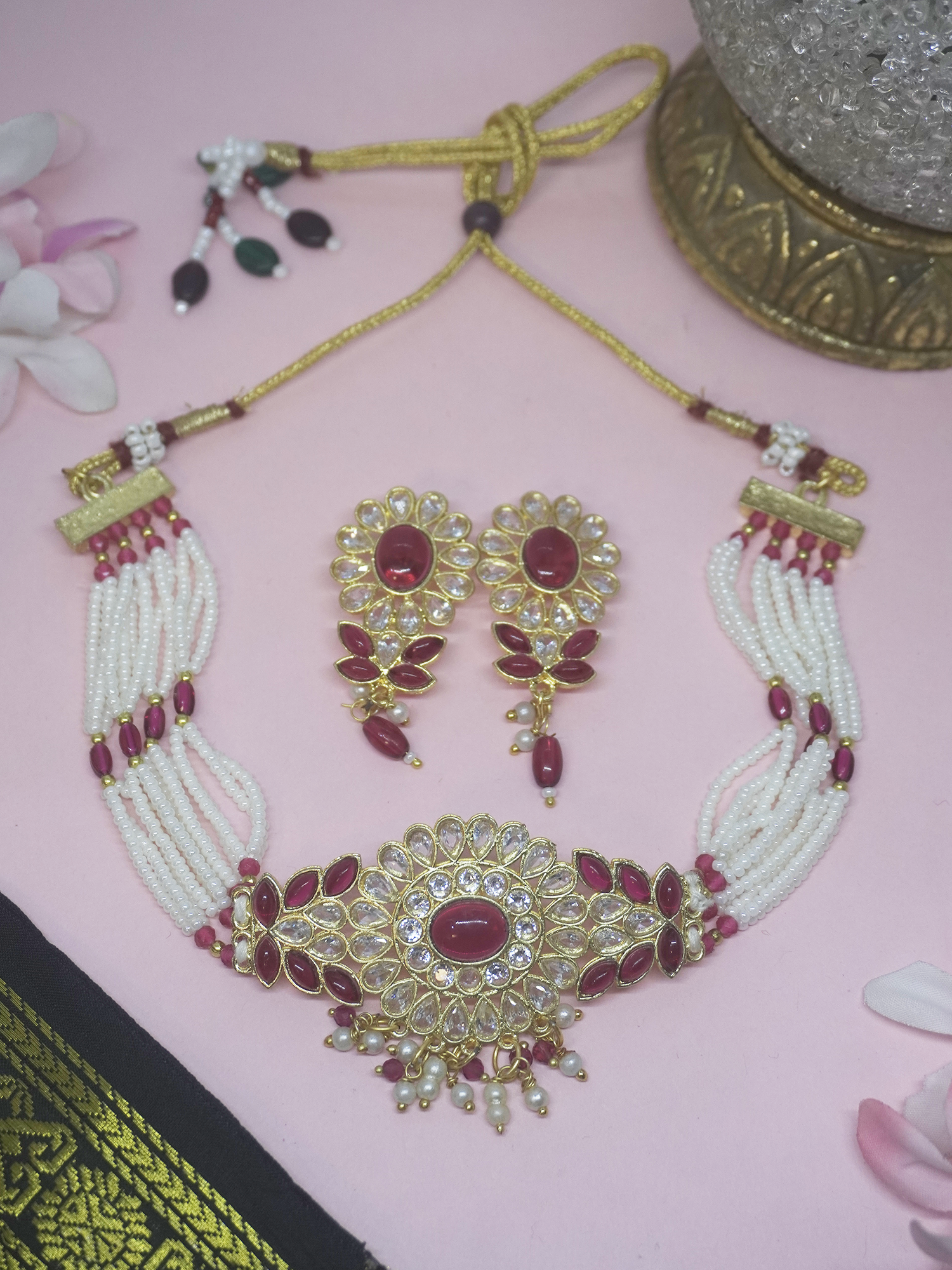Adorn yourself with this 24K gold-plated choker necklace and earring set. Made of brass, it features a beautiful floral design with water drop Kundan and pink stones. The necklace boasts a multi-layered small white pearl chain. Mesmerizing earrings, also studded with Kundan and pink stones, have pearl and pink bead hangings. Handcrafted by local artisans, this latest ethnic design is perfect for any special occasion.