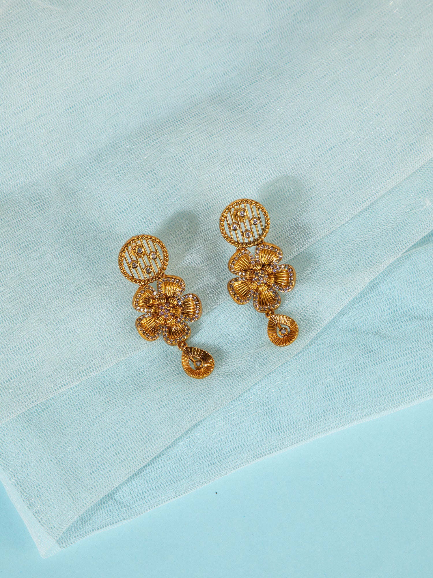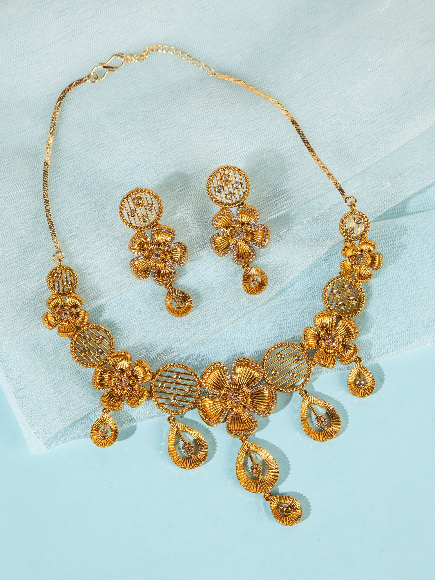 Embrace timeless elegance with this stunning gold-plated necklace and earring set, designed with intricate floral motifs and sparkling zircon stones. The delicate flower-inspired design adds a graceful charm, while the shimmering zircon detailing brings a luxurious brilliance to every look. Perfectly crafted to reflect ethnic beauty with a modern touch, this set is ideal for weddings, festive occasions, and special celebrations. Lightweight yet eye-catching, it enhances your outfit with effortless sophistication.