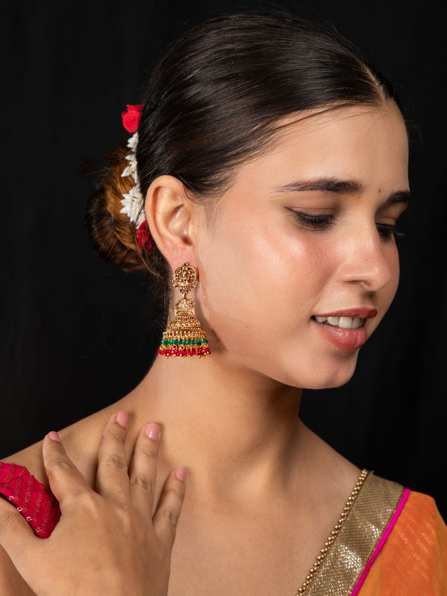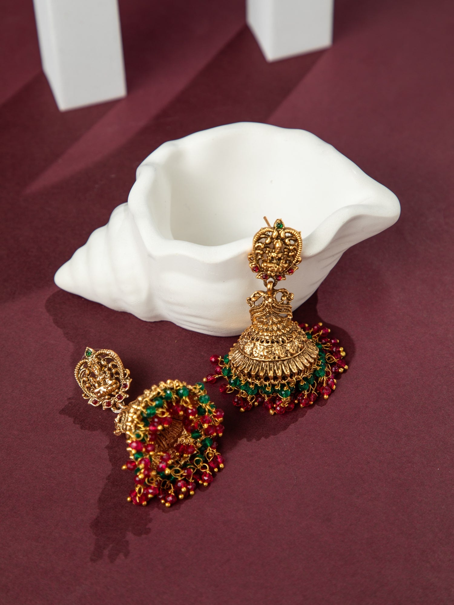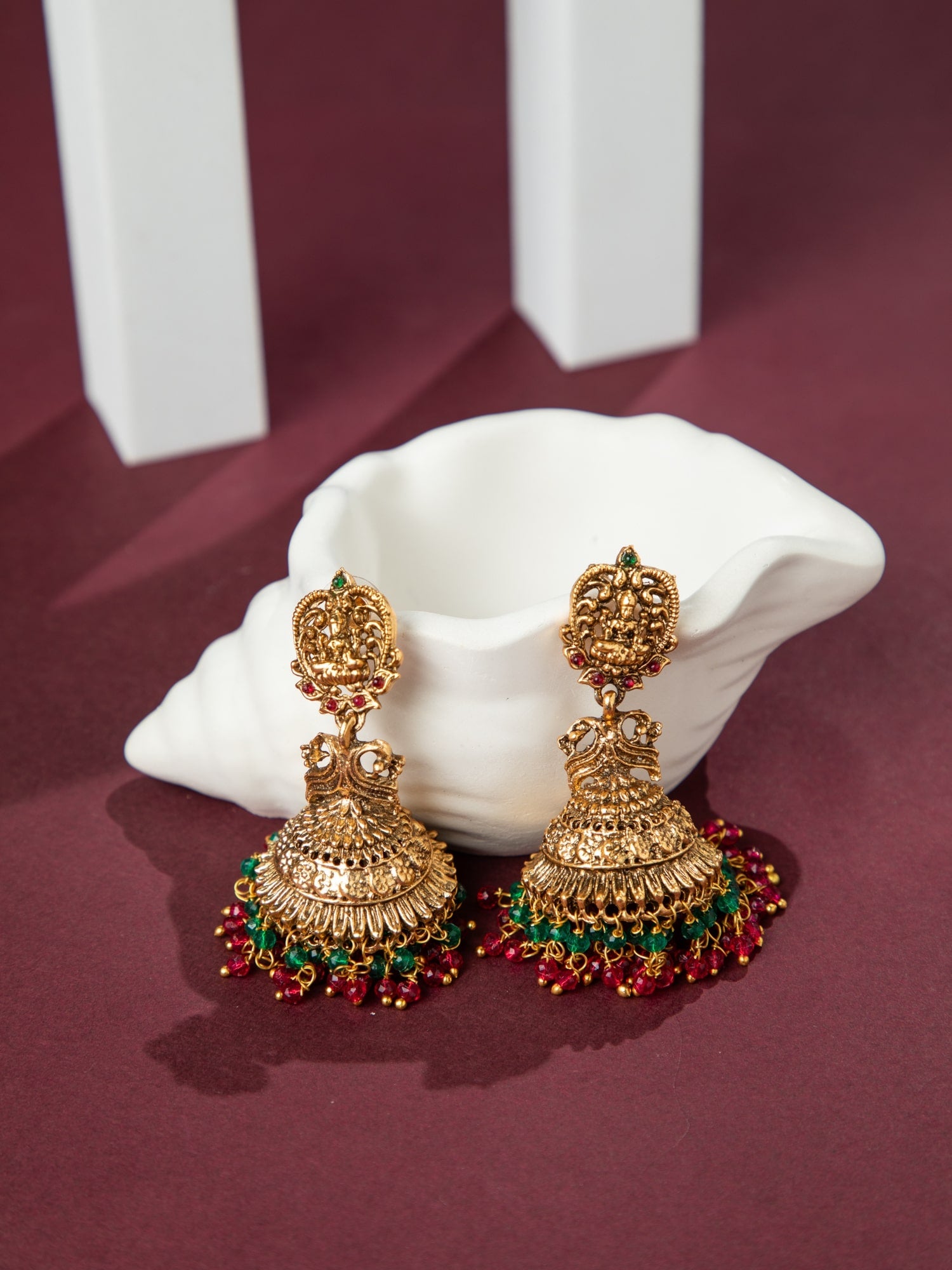 24K Gold Plated Goddess Lakshmi Temple Jhumka Earrings with Red and Green Faux Pearls