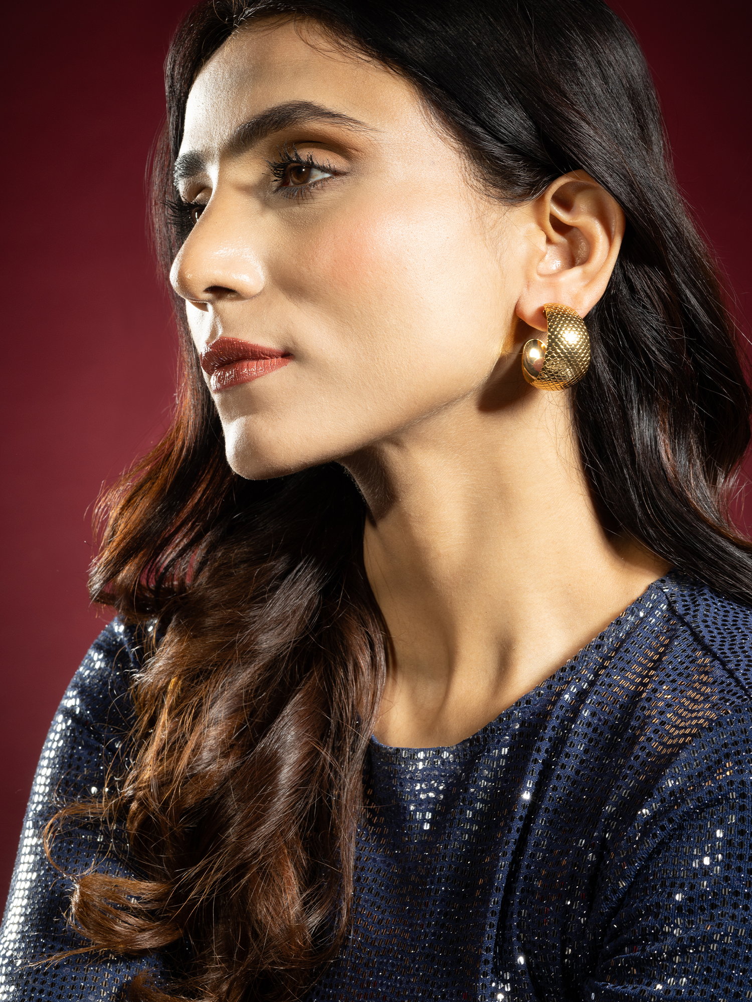 Pair these timeless gold-plated round earrings with a sleek bun and a classic little black dress for a sophisticated evening look. Let their elegant design add a touch of luxury to your ensemble.