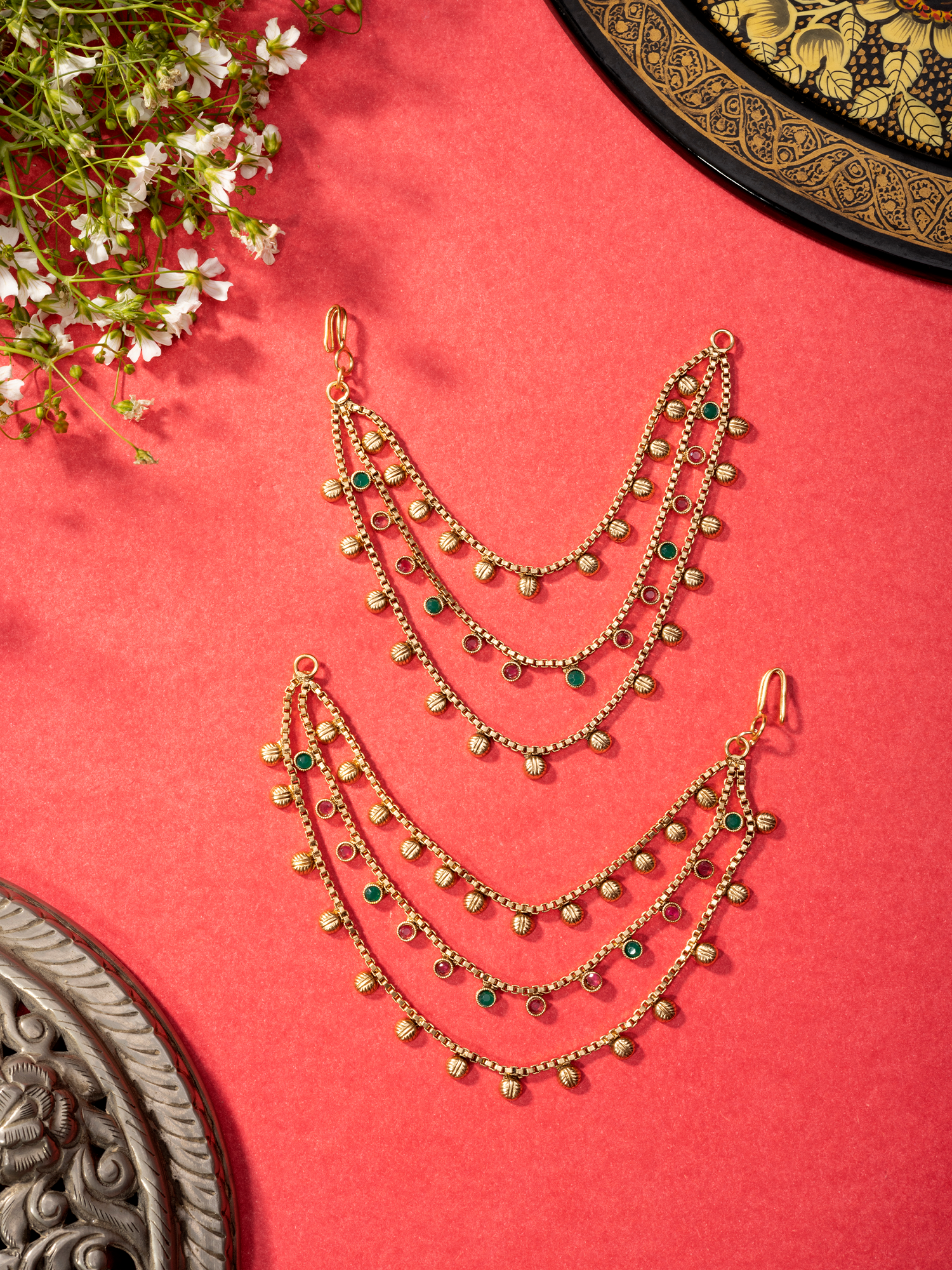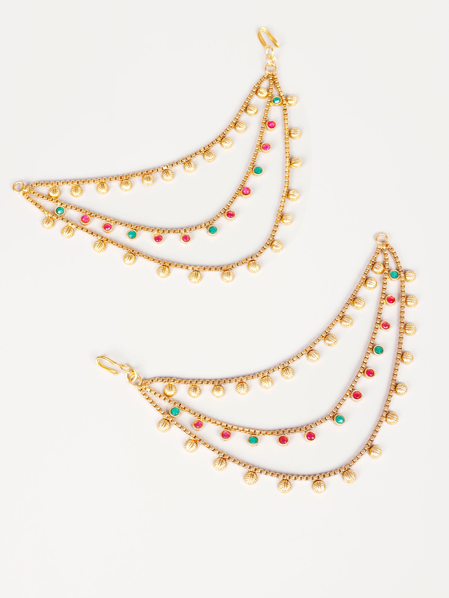 Introducing our exquisite 24K Gold-Plated Ruby and Emerald Multi Layer Ear Chain, featuring a beautiful multi-layer design adorned with fascinating ruby and emerald stones. This ear chain is studded with water drop red and green stones, exuding elegance and sophistication. Handmade by local artisans, it boasts anti-allergic and anti-tarnish properties, ensuring both style and comfort. A must-wear accessory for any occasion, perfect for functions, festivals, and parties, adding a touch of glamour and allure to your ensemble.