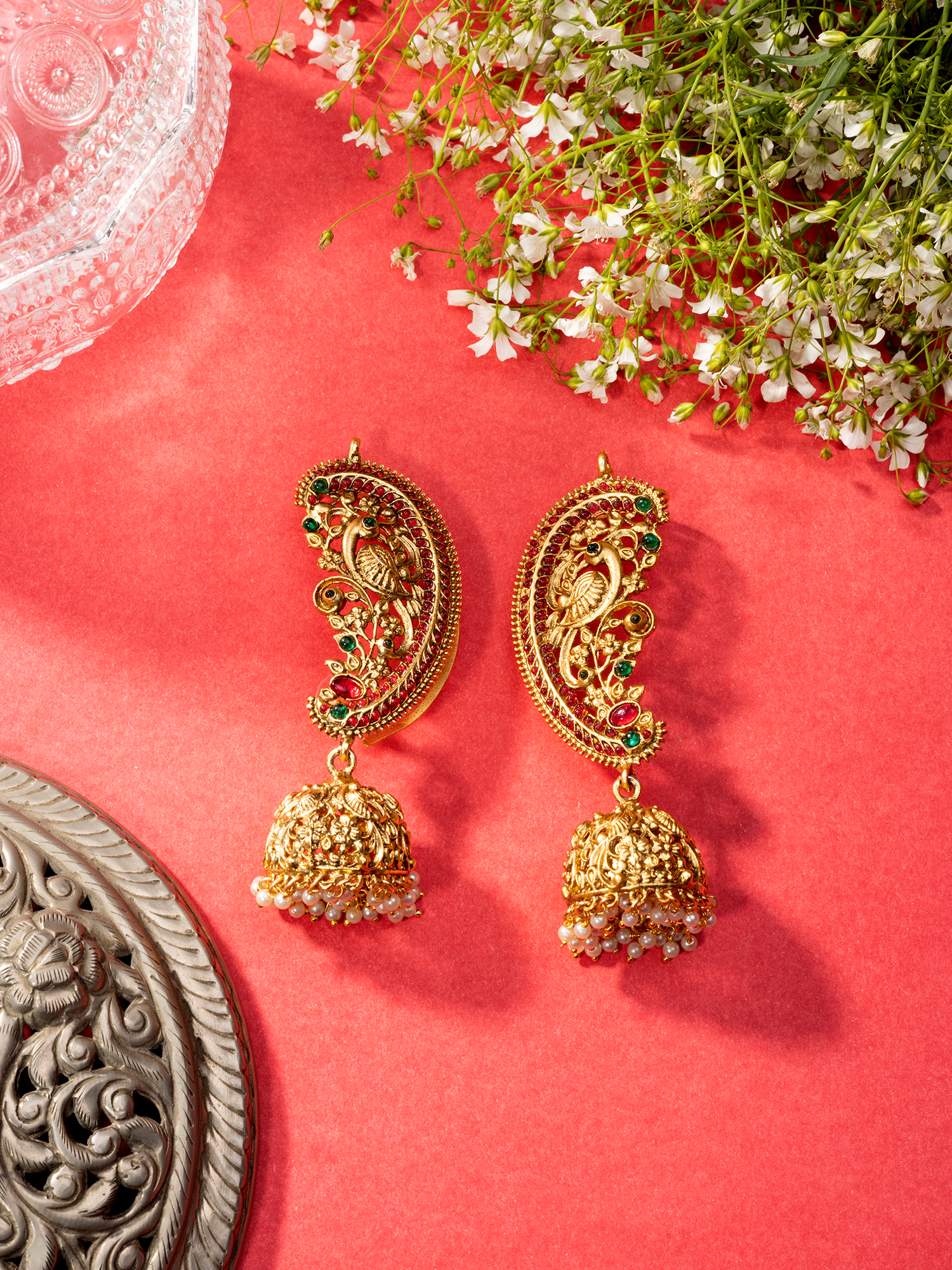 Introducing our exquisite 24K Gold-Plated Traditional Peacock Emerald and Ruby Jhumka Earrings, featuring a beautiful design adorned with fascinating emerald and ruby stones. The Antique Jhumka covers the whole ear with stunning green and red stone detailing, evoking the regal beauty of peacock feathers. Handcrafted by local artisans, these earrings are a must-wear accessory for any occasion. Skillfully crafted with anti-allergic and anti-tarnish properties, they embody the latest design trends with their modern style and traditional charm. Perfect for functions, festivals, and parties, elevate your ensemble with these handmade treasures.