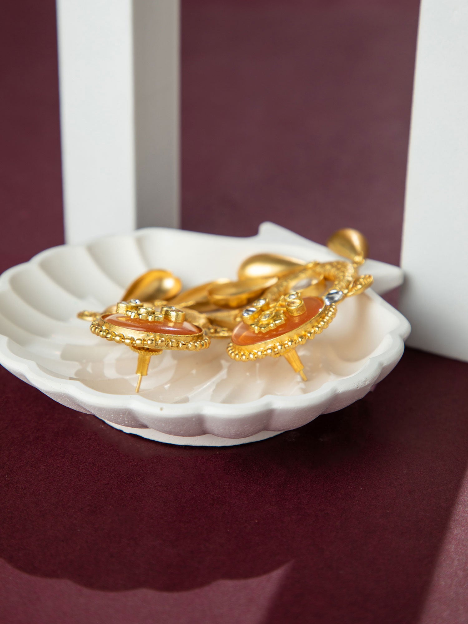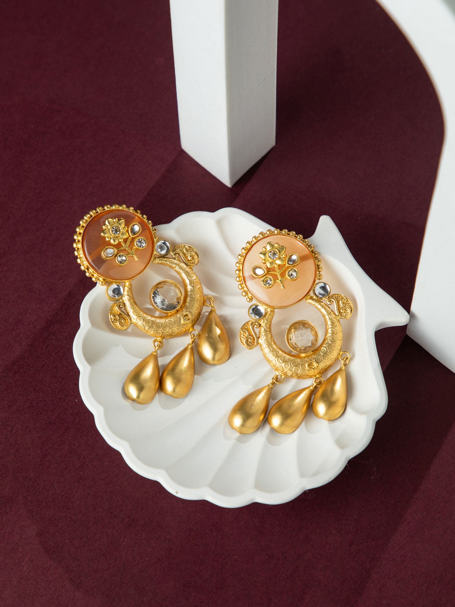 24K Matte Gold Plated Orange and White Chandbali Earrings with Kundan