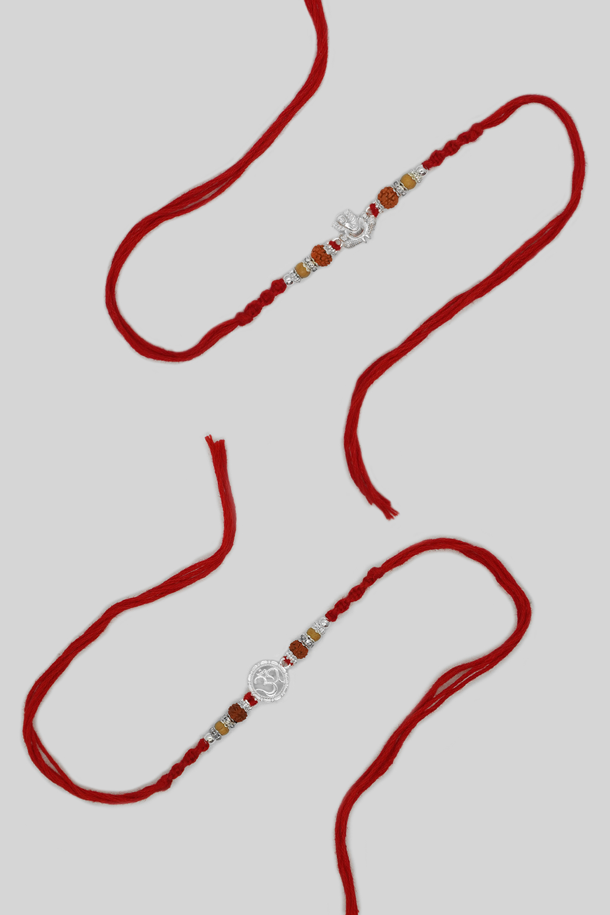 Rakhi 1 - This is a beautiful 925 sterling silver Om designer rakhi with rudraksha beads on the red thread. It has a very fine work pendant and is made up of premium quality.
