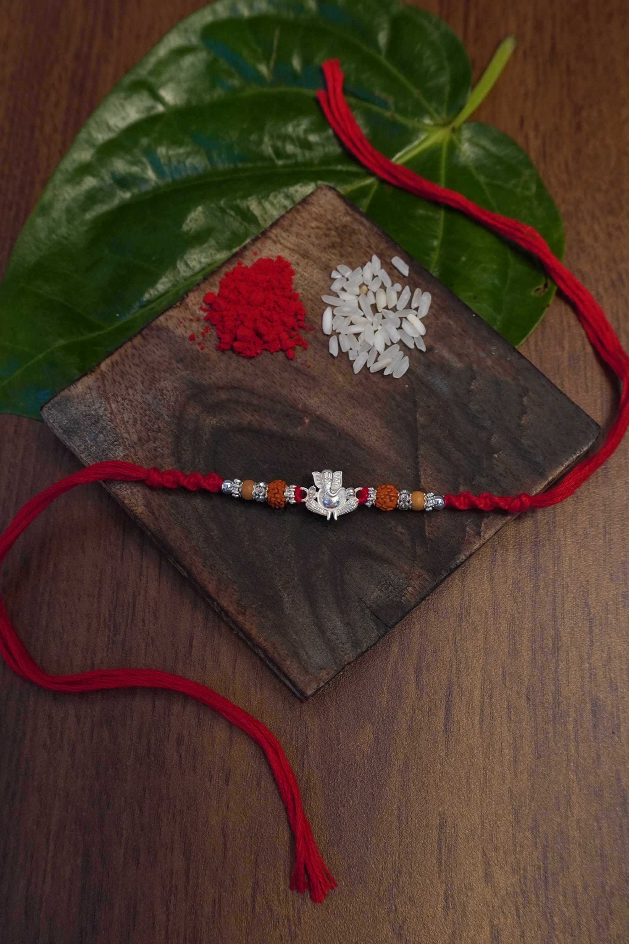 Rakhi 2 - This is a beautiful 925 sterling silver Ganesh designer rakhi with rudraksha beads on the red thread. It has a very fine work pendant and is made up of premium quality.