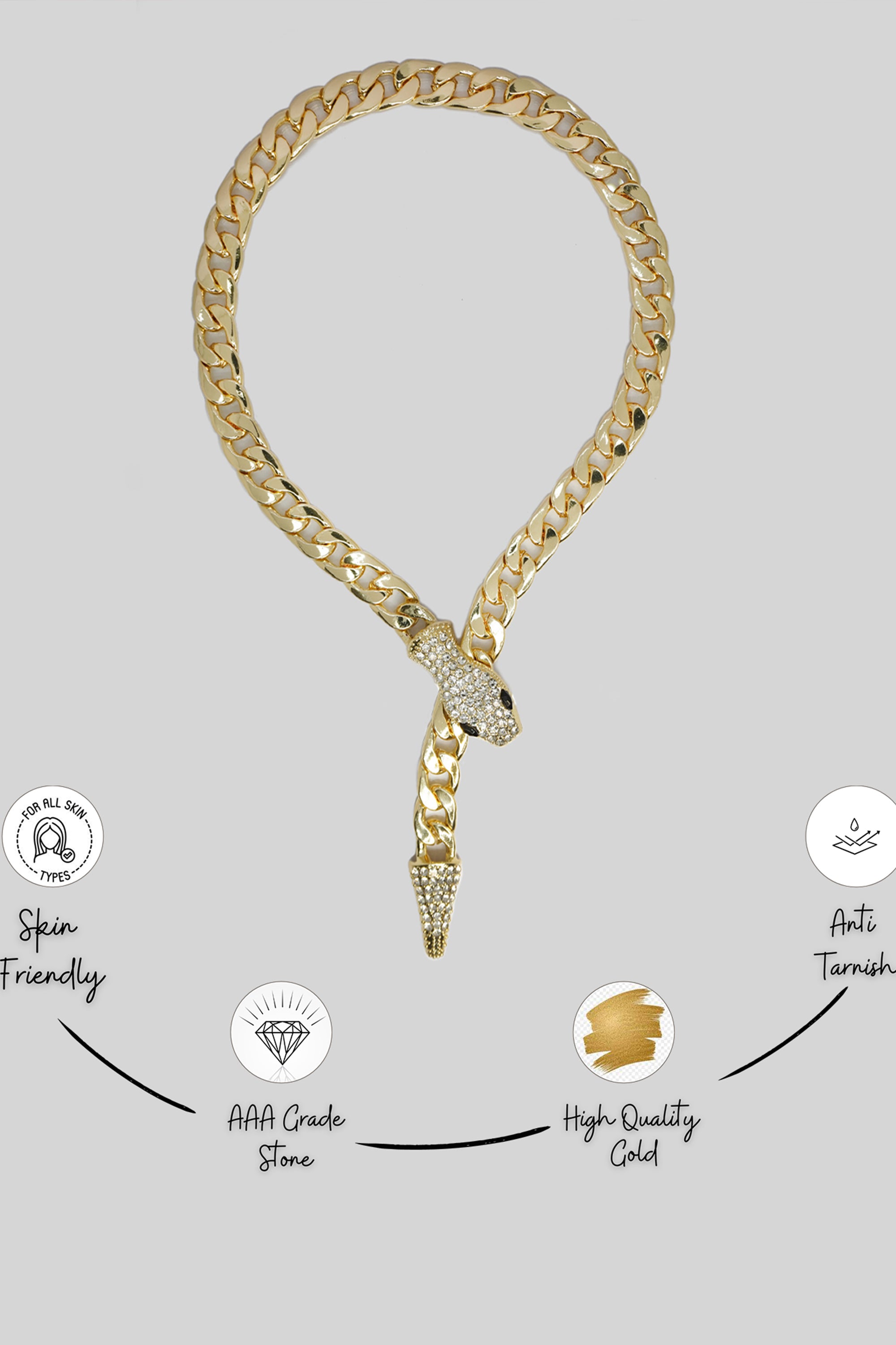 Looking for something stylish then this piece of jewellery is perfect for you. The impressive snake necklace is made of stainless steel and is gold-plated. AAA-grade American Diamonds and black stones gave the detailed look to the face and tail. Its lightweight makes it comfortable to wear it.