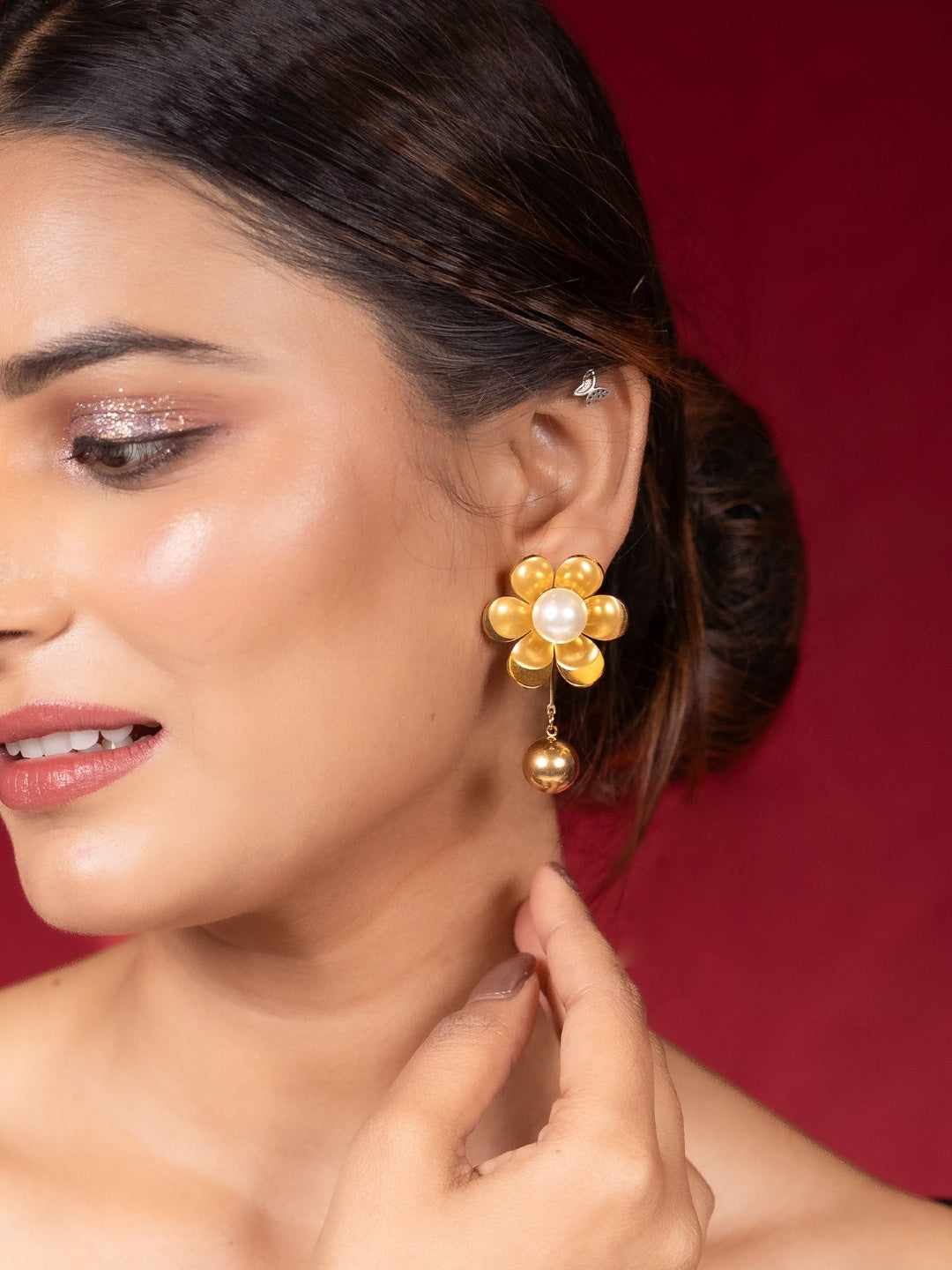 Pair these anti-tarnish floral pearl dangler earrings with a flowy pastel dress or a saree for a romantic and sophisticated look. For a chic everyday style, match them with a crisp white blouse and jeans. Opt for a soft updo or loose waves to showcase their elegant floral design.