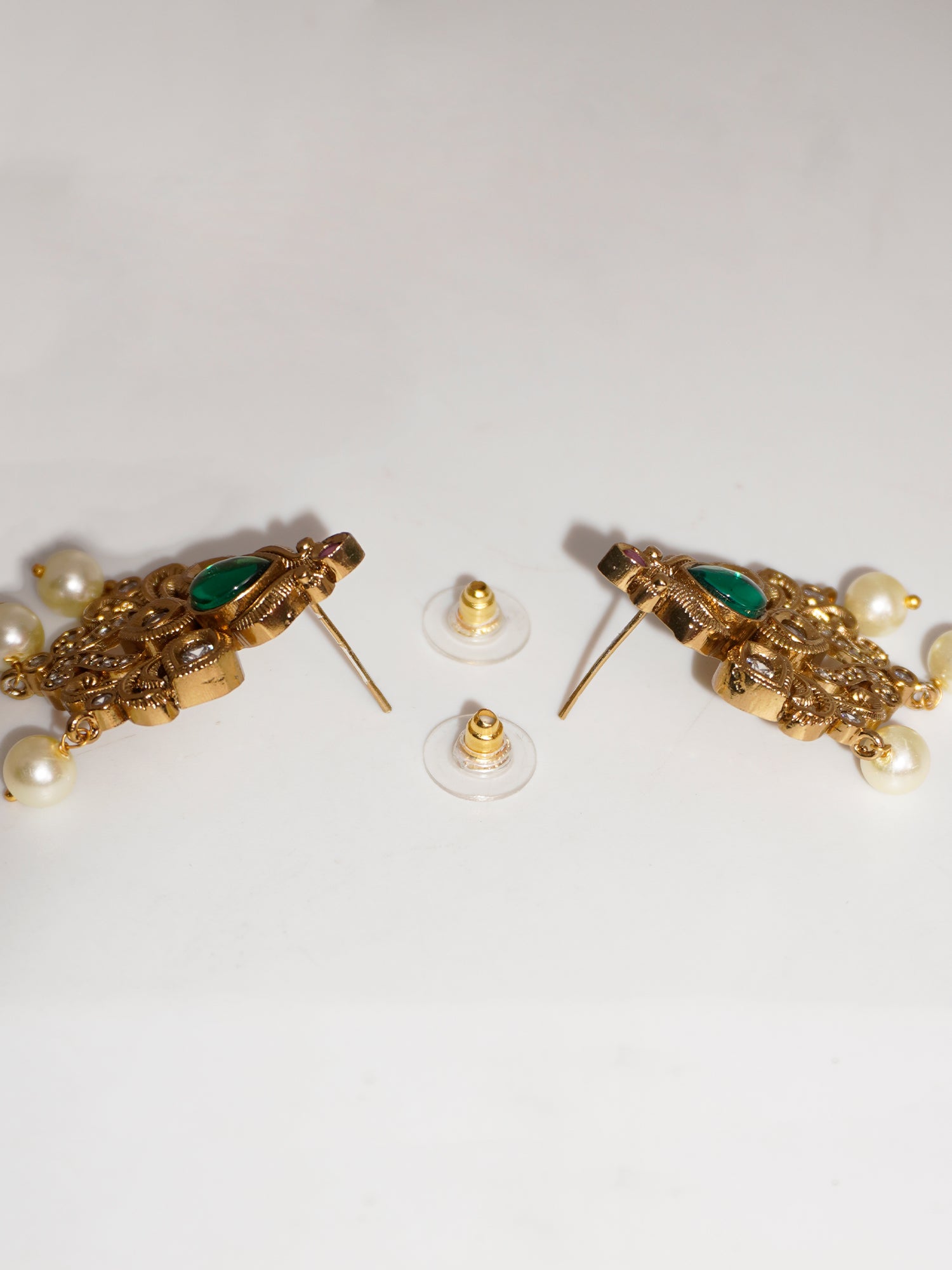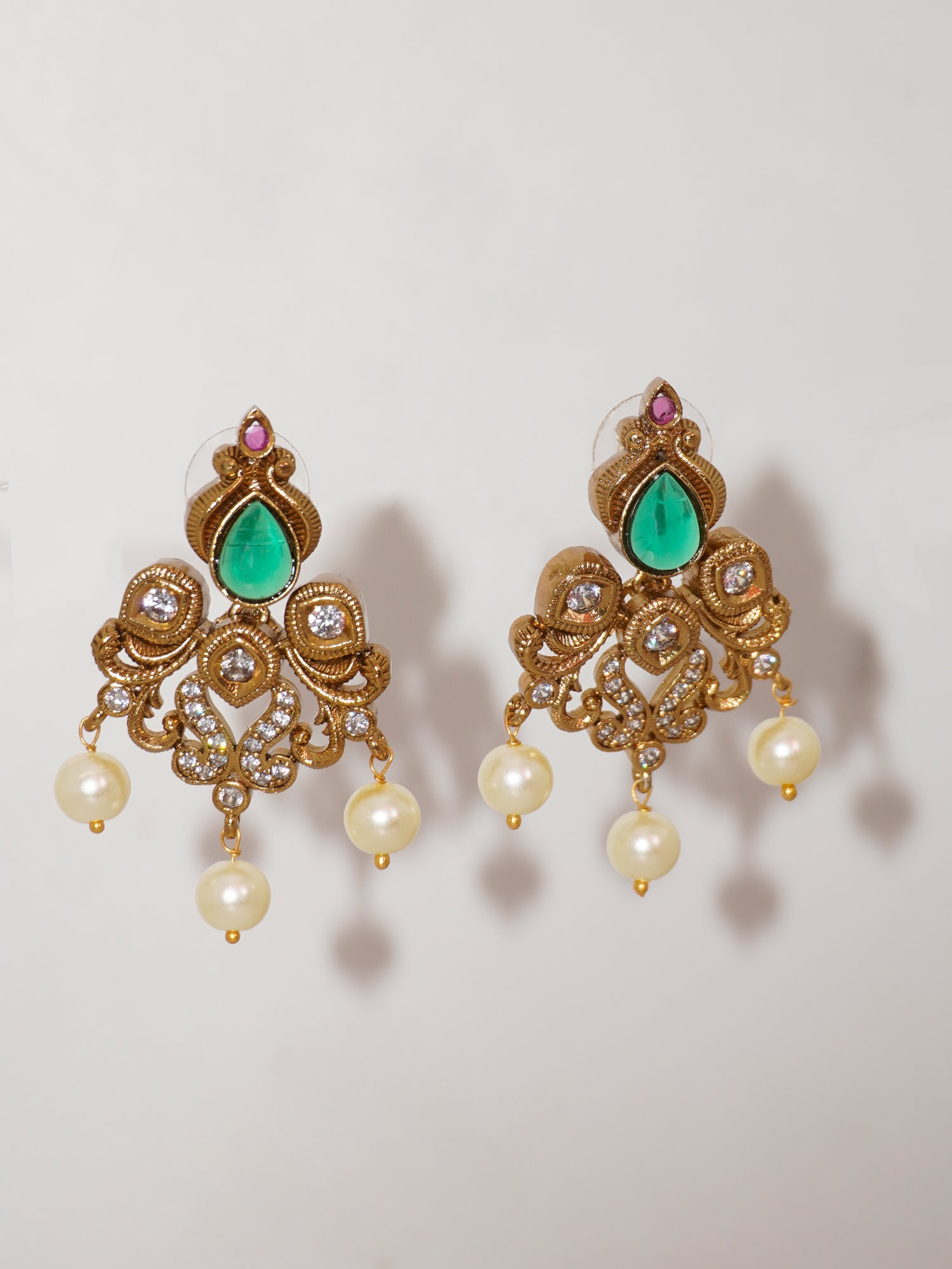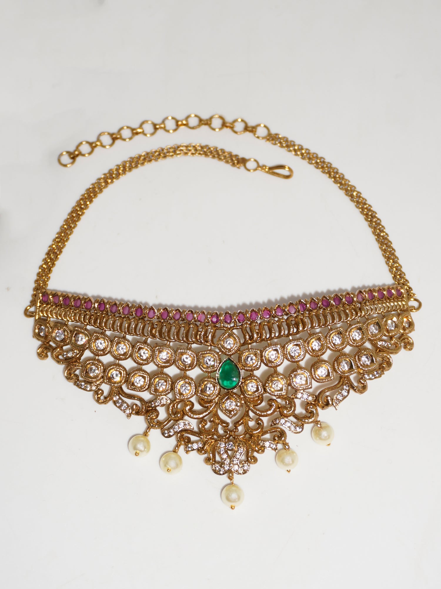 Elegant 24K gold-plated traditional choker set with mesmerizing earrings, featuring antique design, CZ stones, emerald-green waterdrop stones, and faux pearls. A gorgeous, handcrafted must-have for festive, party, or function wear. Stunning new design by local artisans.