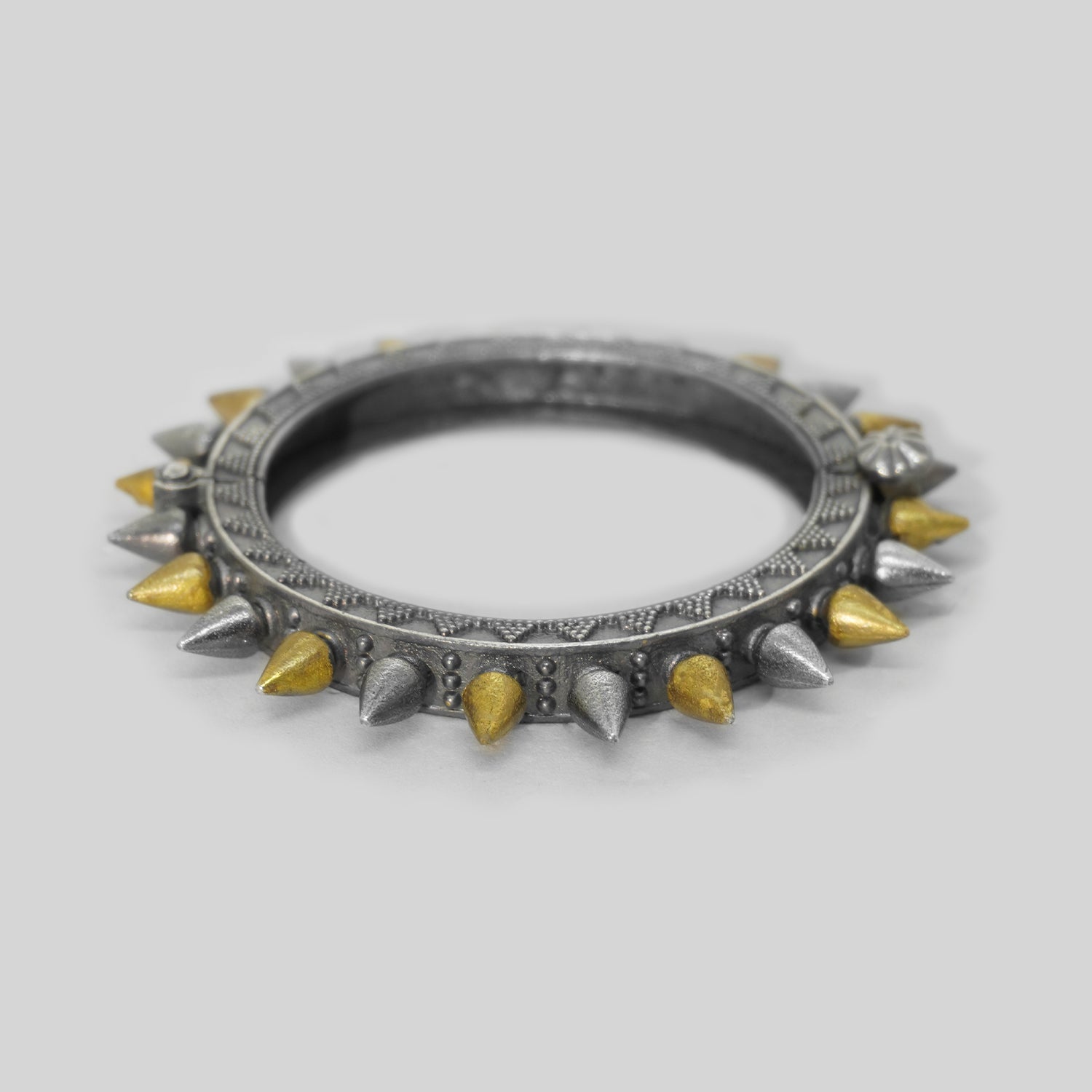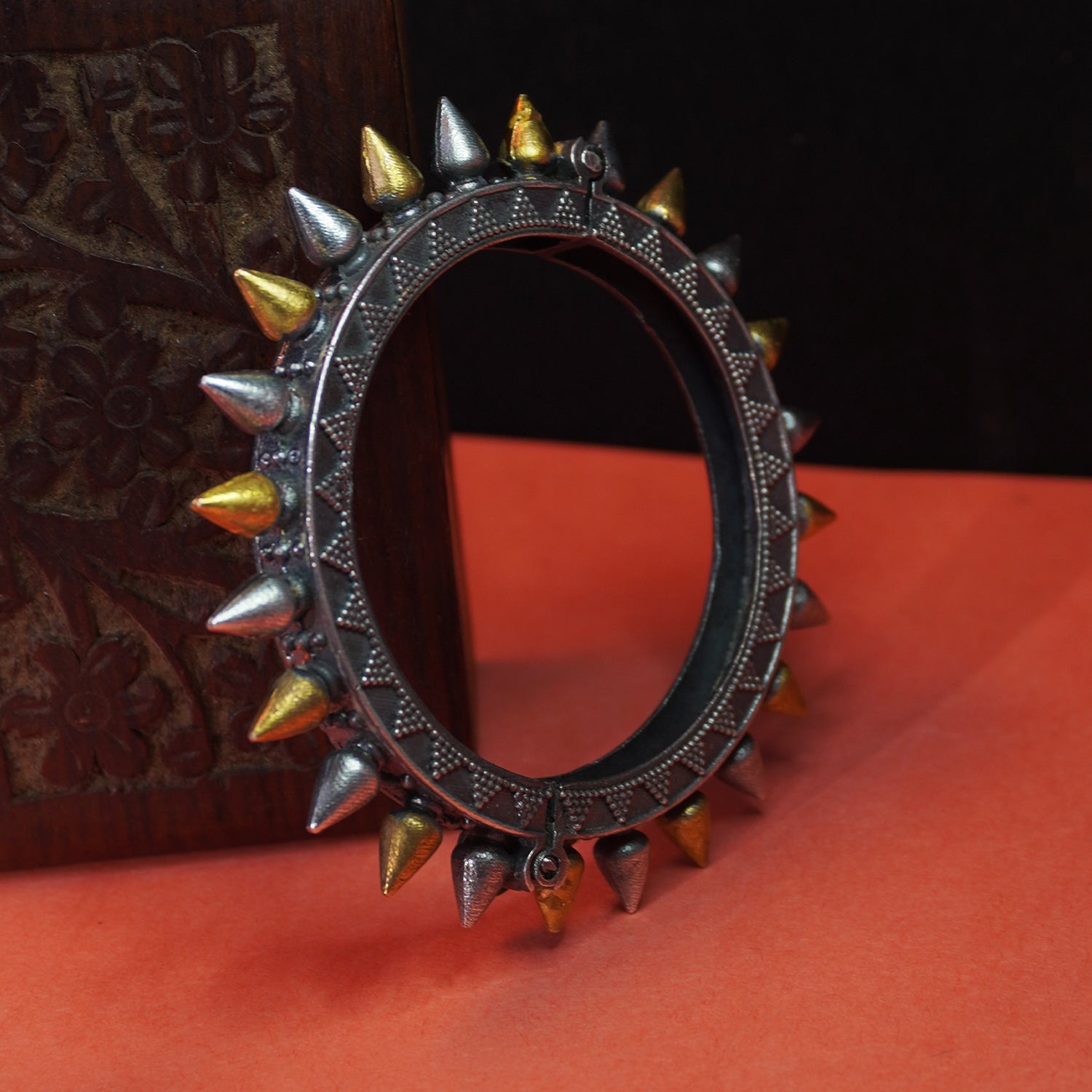 Our team believes in enhancing pure elegance and in bringing style. This antique cone spike kada is here to keep you up with elegance and style. It is thoroughly polished with silver and gold. The spikes make it more adorable and unique. The kada is free in size and openable. And the smoothness and lightweight makes it comfortable to pair with any ethnic outfit.