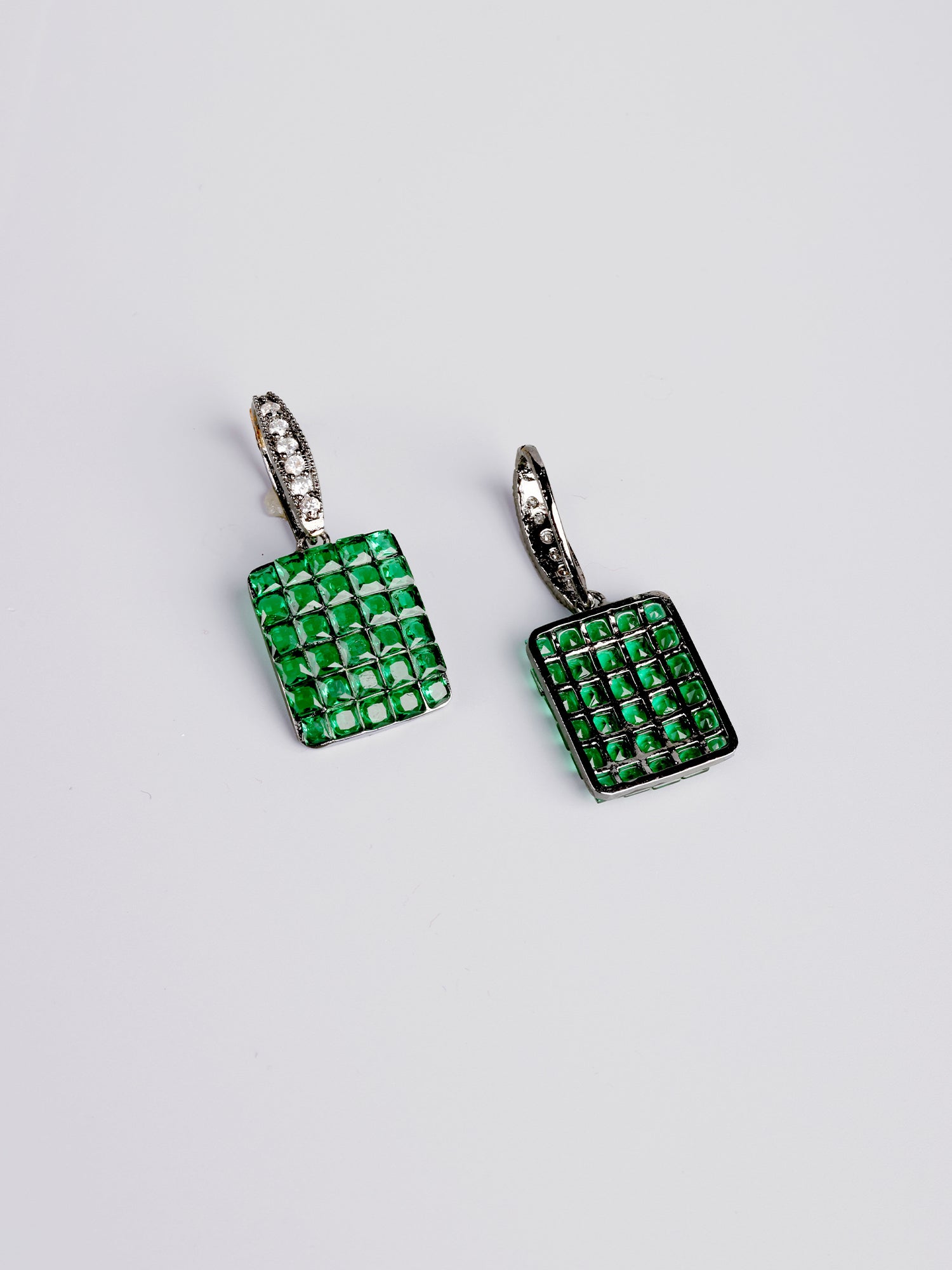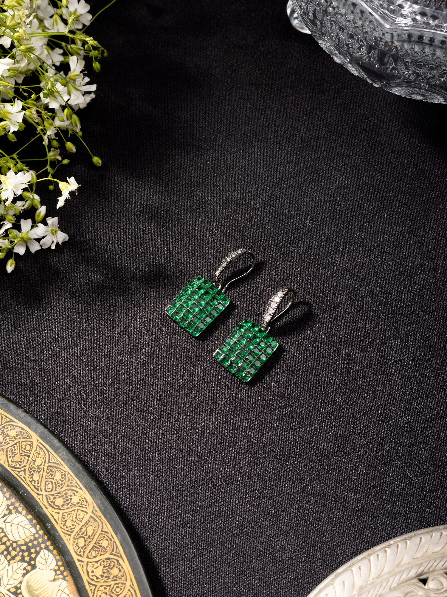 Elevate your elegance with our Black Rhodium-Plated White and Green Earrings, featuring exquisite emerald and white CZ stones. Each earring boasts a breathtaking design, meticulously crafted by local artisans. With contemporary flair and anti-allergic, anti-tarnish properties, these earrings are perfect for functions, festivals, or party wear. Handmade to perfection, they blend timeless sophistication with modern style, adding a touch of luxury to any ensemble. Embrace the allure of fine craftsmanship with these artfully designed earrings that effortlessly capture attention.