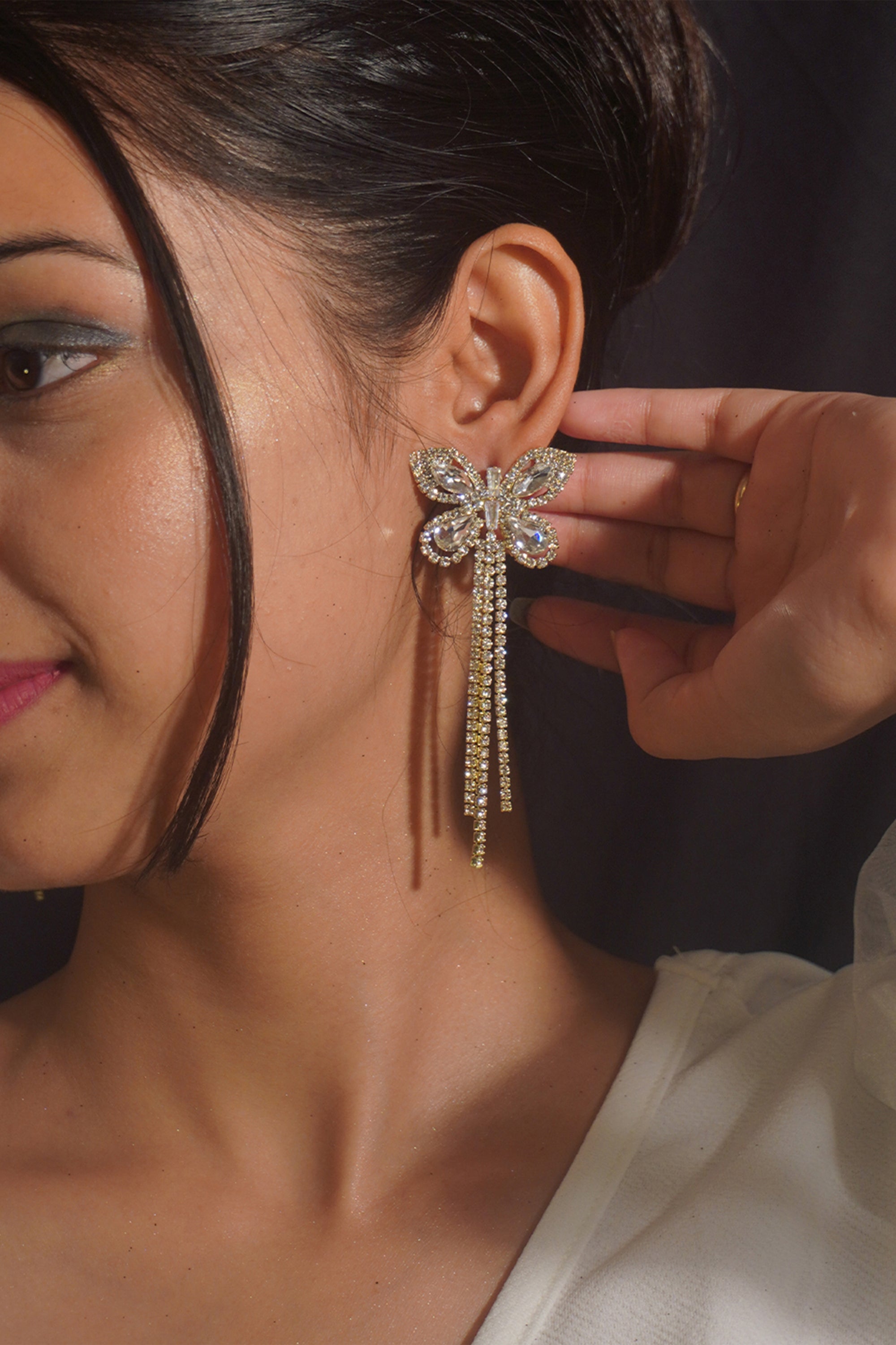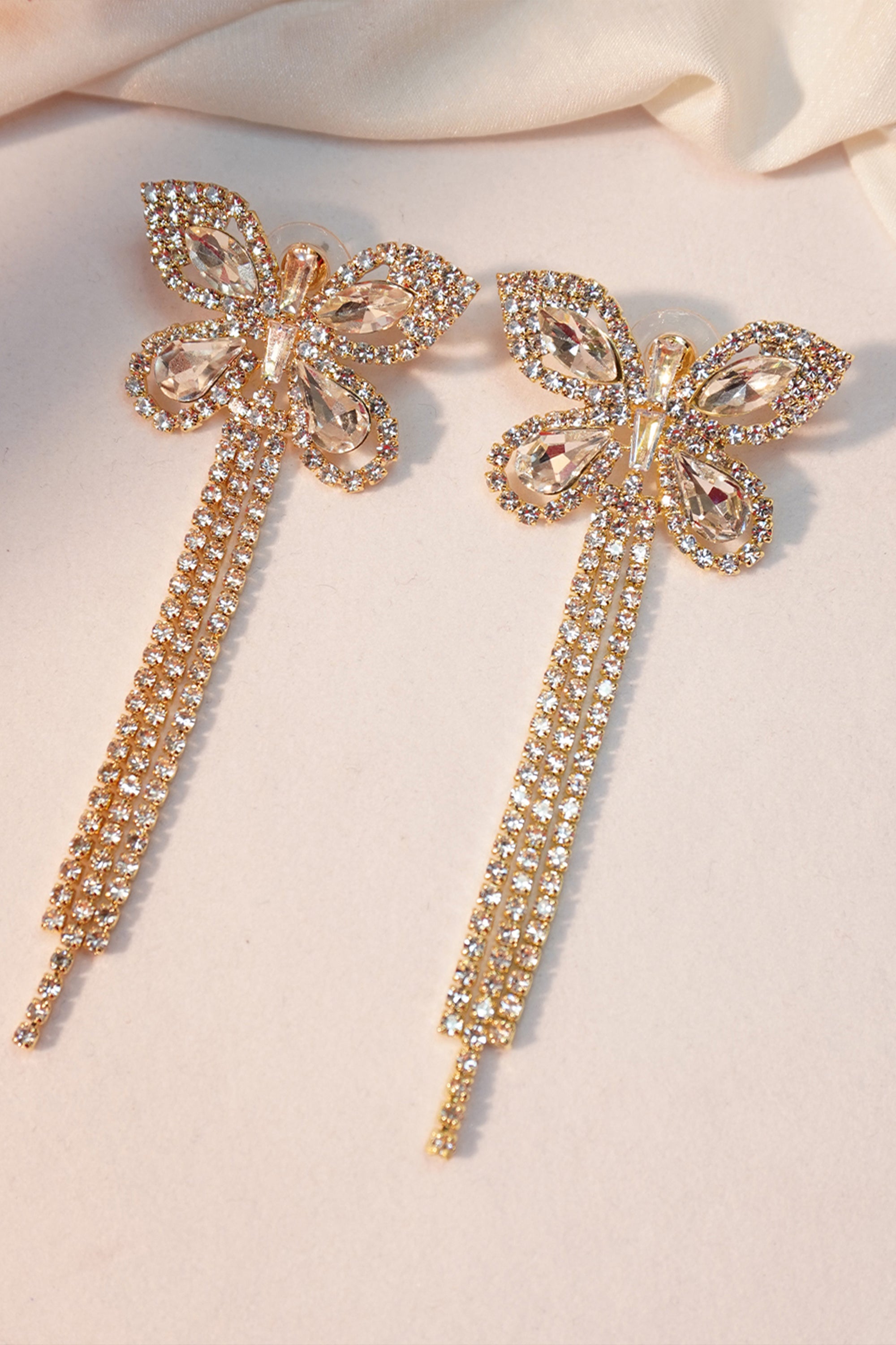 You’ll effortlessly fall in love with these beautiful bejeweled dangler earrings. This butterfly dangler earring is crafted with rhinestone crystals and AAA-grade American Diamonds. The vibrant shine makes this earring a show-stopper. The butterfly and shimmering danglers give it an alluring look. The body is finely polished with gold. And its lightweight makes it more comfortable.