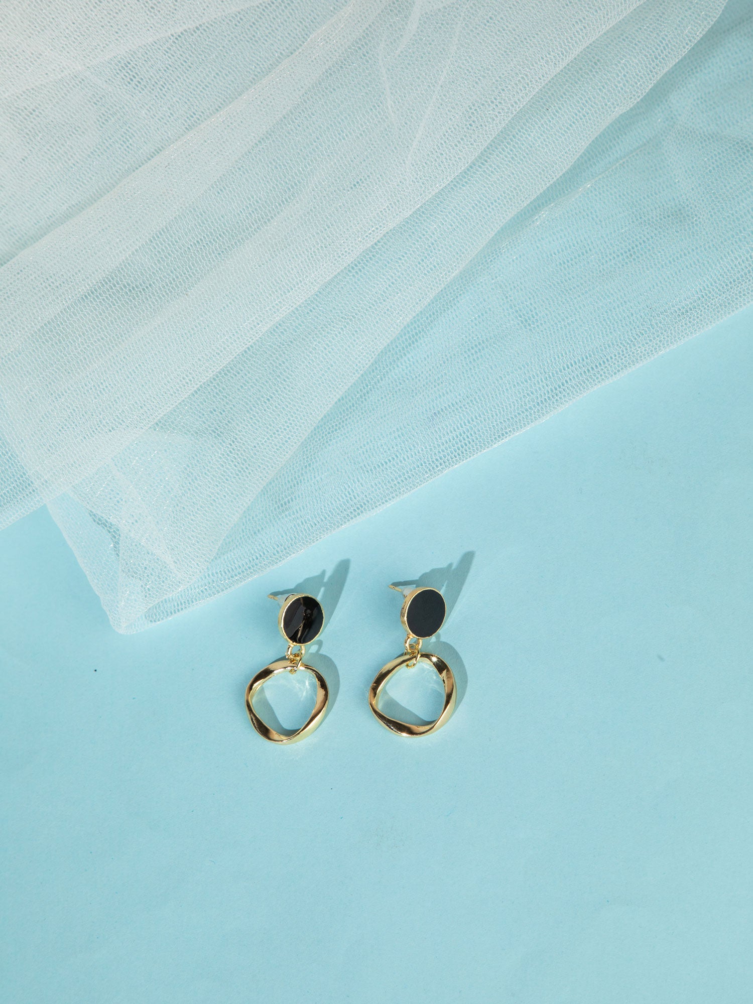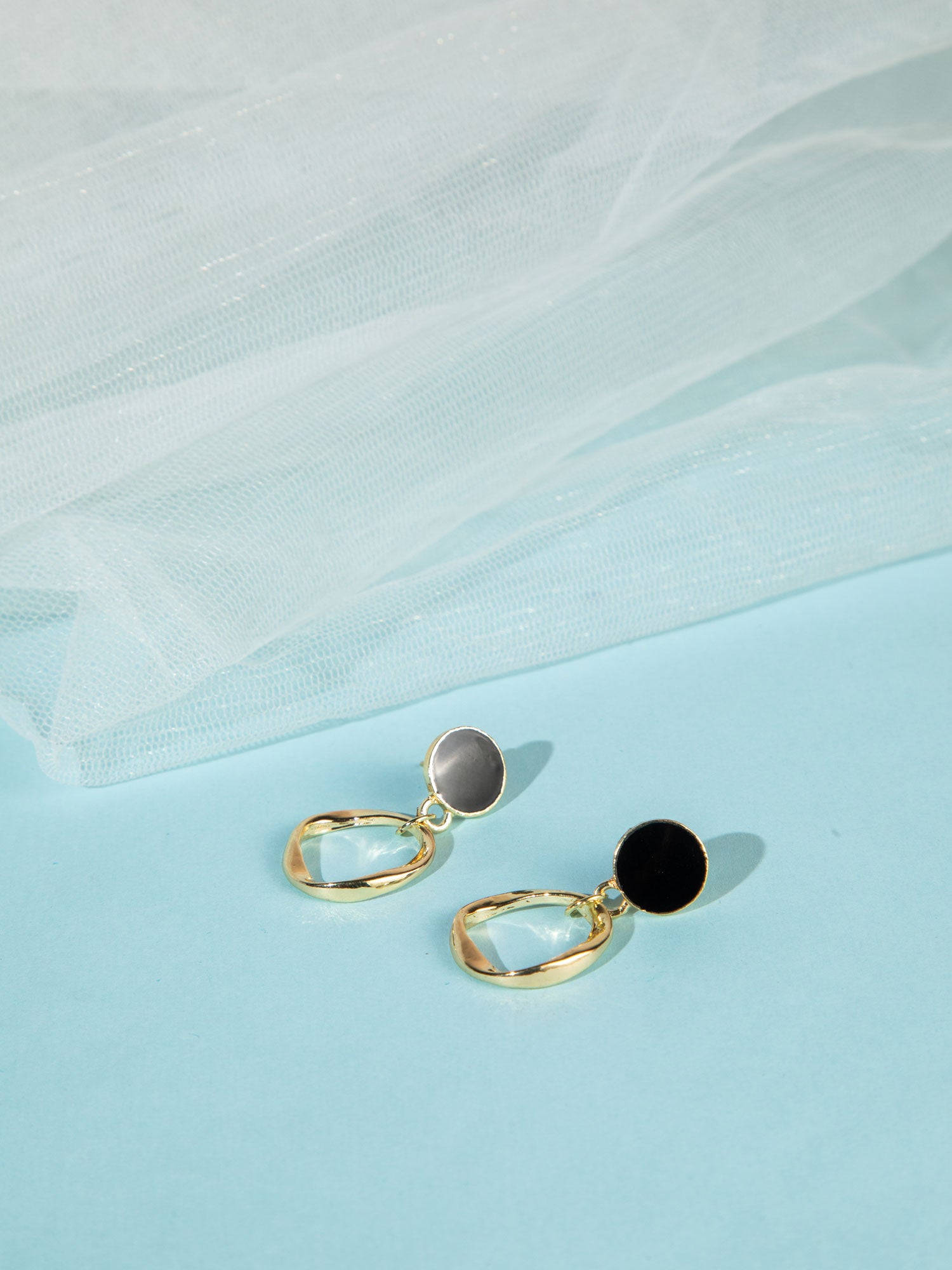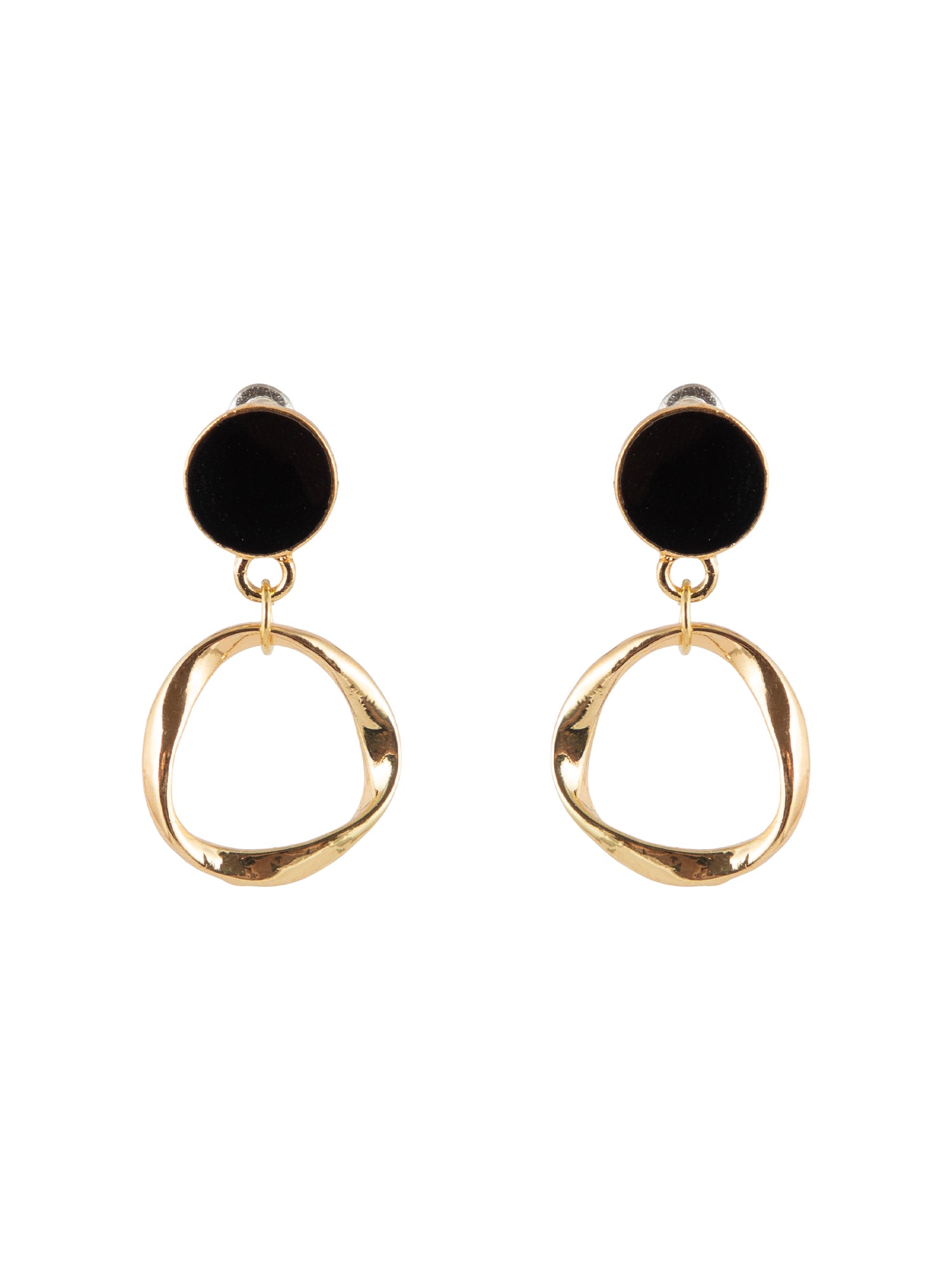 These stylish gold-plated drop earrings feature a bold black circular design, creating a striking contrast with the warm gold finish. The sleek drop silhouette adds movement and elegance, while the minimal yet eye-catching design makes them perfect for both casual and evening wear. Lightweight and versatile, these earrings bring a modern edge to your accessory collection.