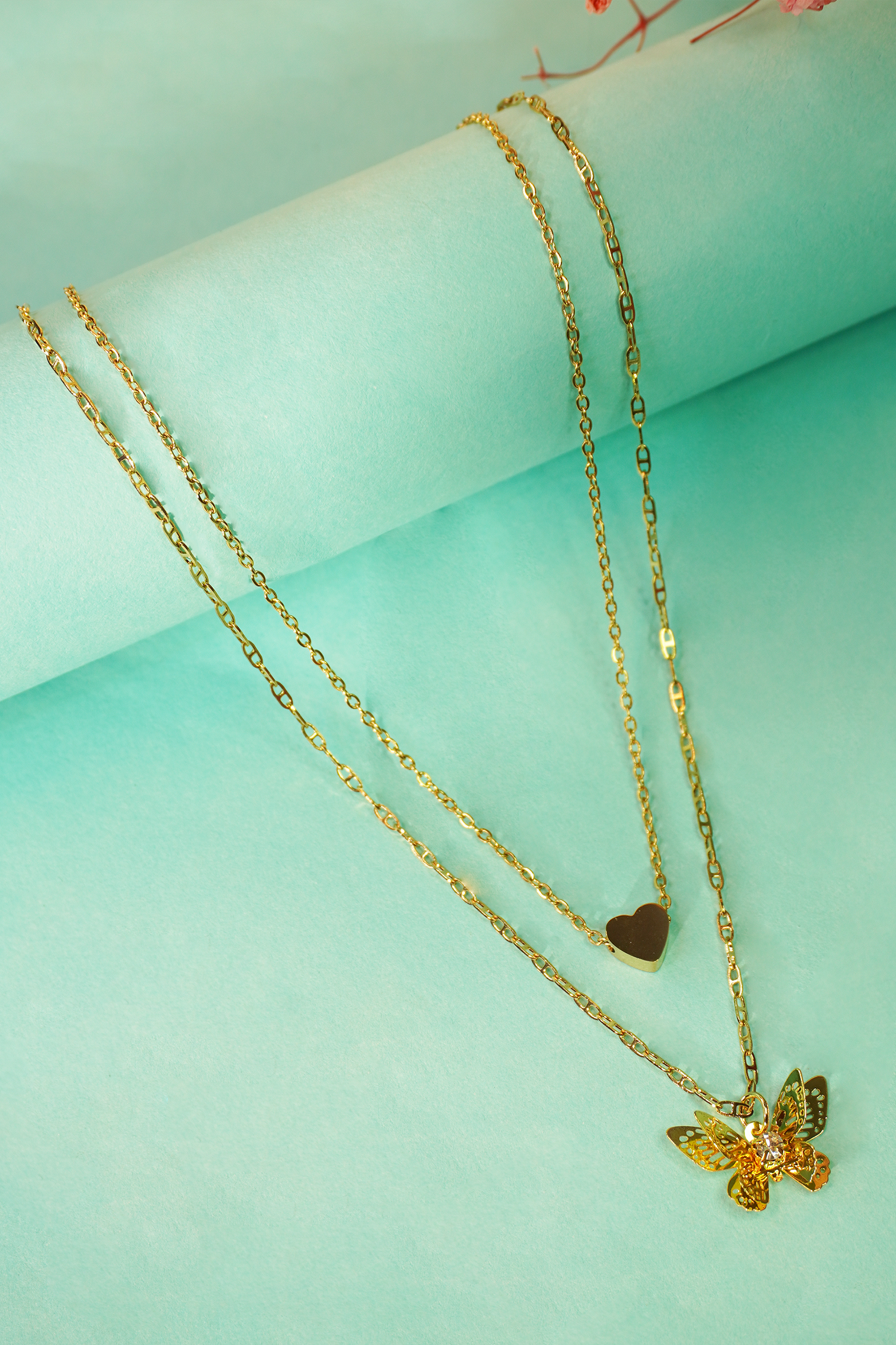 Flaunt this double-layer chain with a cuddly heart in one and a butterfly pendant on the other. Astounding the beauty in a sparkling way with this piece of jewellery. It is beautifully polished with gold and features with stainless gold chain. A white stone in the middle of the butterfly beautifies the jewellery and makes it more graceful to pair with any casual outfit. The lightweight makes it more comfortable.