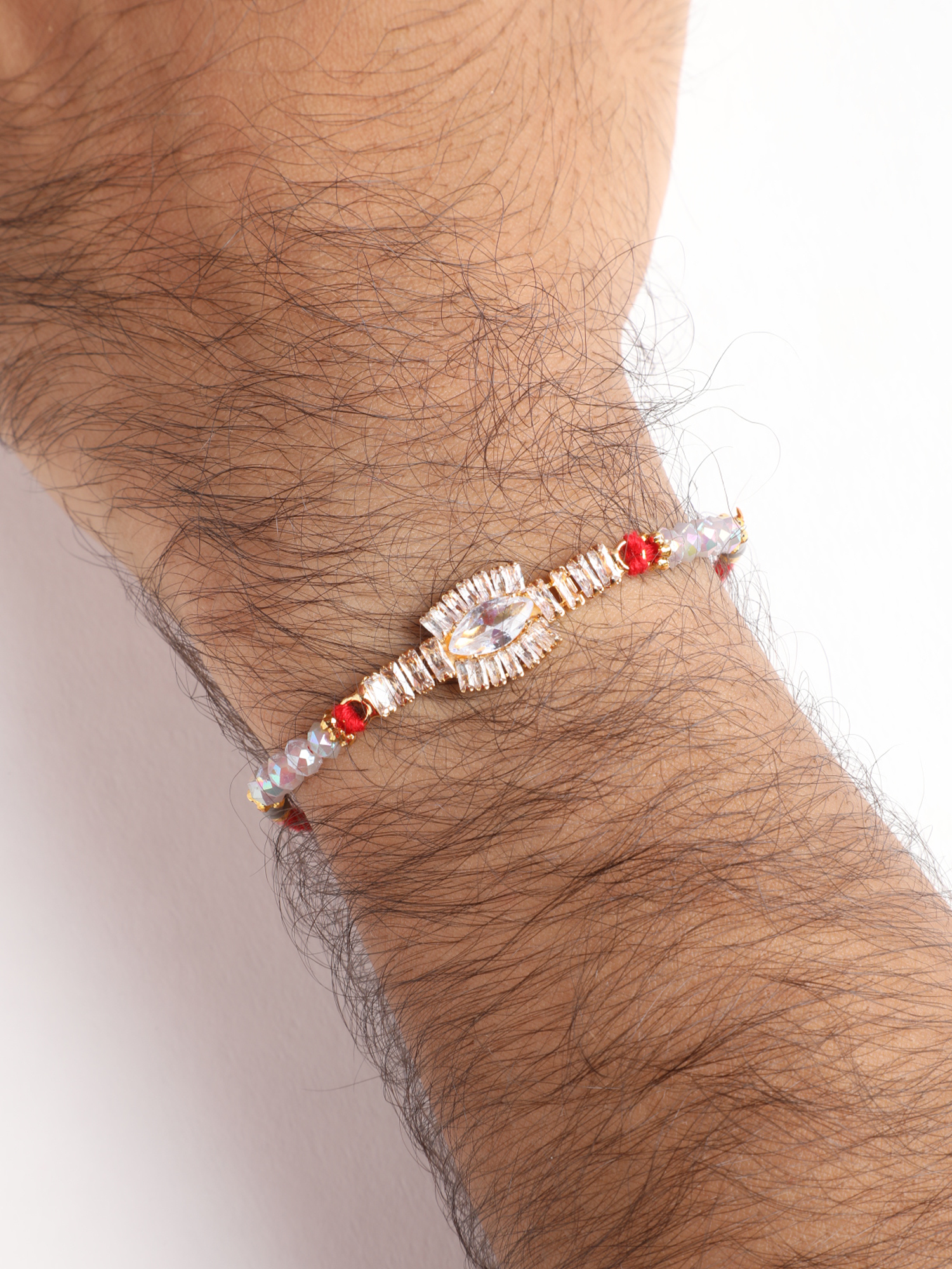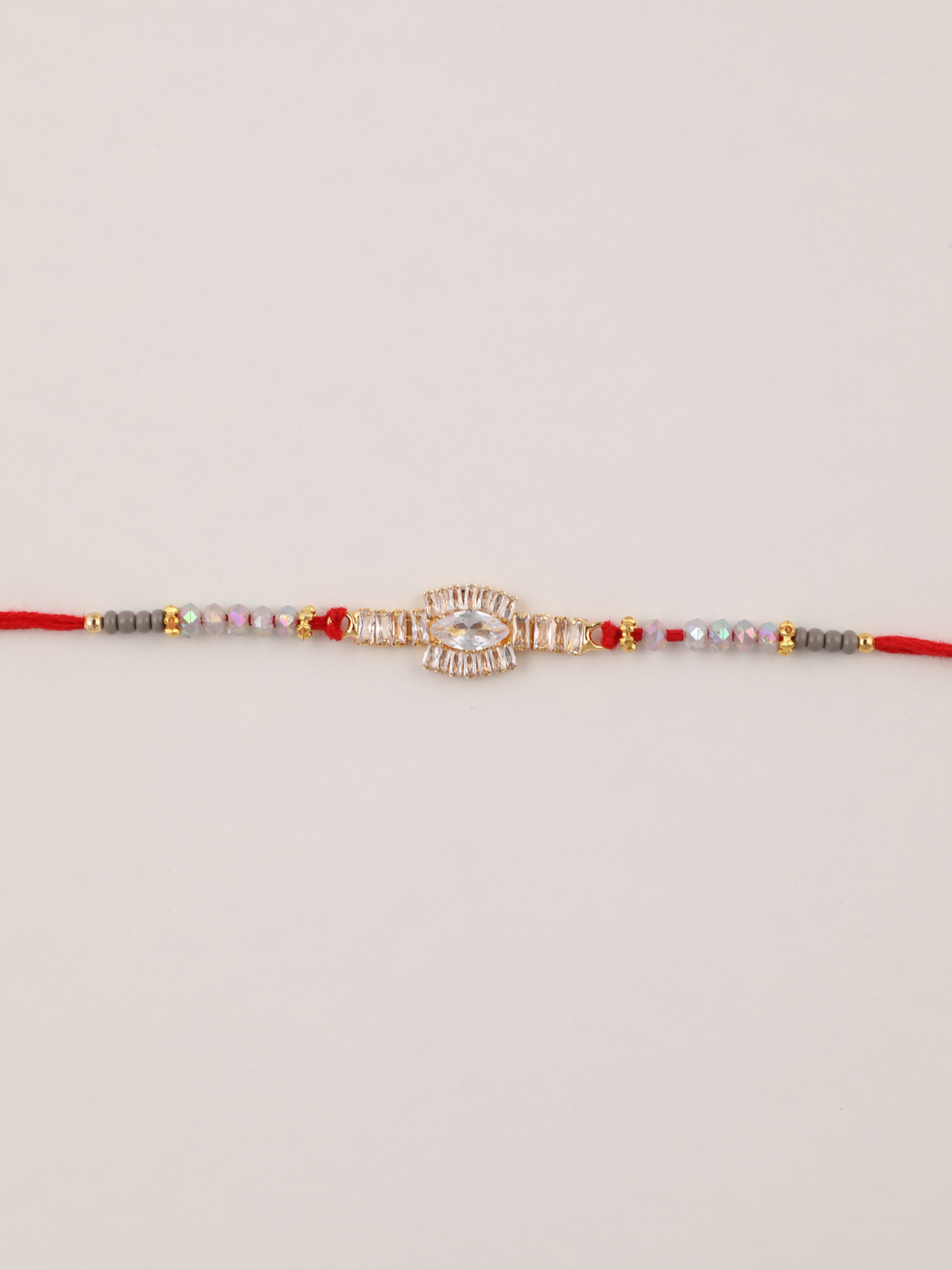 Rakshabandhan is a beautiful festival which is celebrated all over India with lots of joy and happiness. This is the time for a get together celebration with your siblings and close once. Let’s celebrate this unbreakable bond with Niscka Rakhi. This is a beautiful 18k gold plated designer rakhi with Zirconia Cz embedded in it. It has very classy crystal balls studed on the red thread. This is a band style rakhi for your loved ones. Your siblings will surely love the design and quality. Includes- Designer Rakhi, Roli and rice.